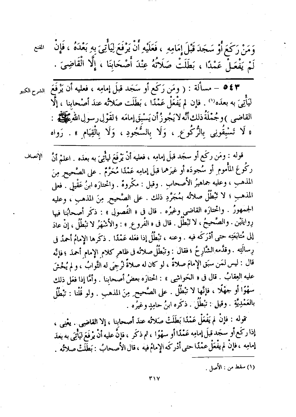 قوله: ومن ركَع أو سجَد قبلَ إمامِه، فعليه أنْ يَرْفَعَ ليأْتِيَ به بعدَه. اعلمْ أنَّ ركُوعَ المأْموم أو سُجودَه أو غيرَهما قبلَ إمامِه عَمْدًا مُحَرَّمٌ. على الصَّحيحِ مِنَ المذهبِ، وعليه جماهير الأصحابِ. وقيل: مكْروهٌ. واخْتاره ابنُ عَقْيلٍ. فعلى المذهبِ؛ لا تَبْطُلُ صلاتُه بمُجَرَّدِ ذلك. على الصَّحيحَ مِنَ المذهبِ، وعليه الجمهورُ. واخْتارَه القاضي وغيرُه. قال في «الفُصولِ»: ذكَر أصحابُنا فيها رِوايَتْين. والصَّحيحُ، لا تَبْطُلُ. قال في «الفُروعِ»: والأشْهَرُ لا تبْطُلُ، إنْ عادَ إلى مُتابَعَتِه حتَّى أدْرَكَه فيه. وعنه، تبْطُلُ إذا فعَله عَمْدًا. ذكَرها الإِمامُ أحمدُ في رِسالَتِه. وقدَّمه الشَّارِحُ؛ فقال: وتبْطُلُ صلاتُه في ظاهرِ كلامِ الإِمامِ أحمدُ في قال: ليس لمَن سبَق الإمامَ صلاةٌ، لو كان له صلاةٌ لرُجِيَ له الثَّوابُ، ولم يُخْشَ عليه العِقابُ. قال في «الحَواشِي»: اخْتاره بعضُ أصحابِنا. وأمَّا إذا فعَل ذلك سهْوًا أو جهْلًا، فإنَّها لا تبْطُلُ. على الصَّحيحِ مِنَ المذهبِ. ولو قلْنا: تبْطُلُ بالعَمْدِيَّةِ. وقيل: تبْطُلُ. ذكَره ابنُ حامِدٍ وغيرُه.