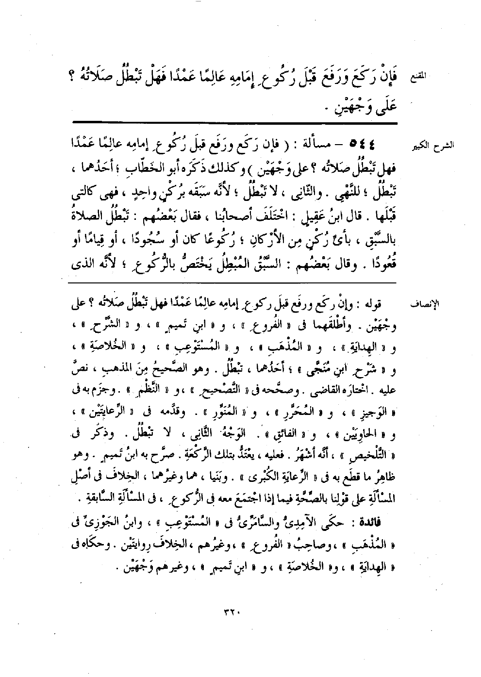 قوله: وإنْ ركَع ورفَع قبلَ ركوعِ إمامِه عالِمًا عَمْدًا فهل تَبْطُلُ صَلاتُه؟ على وجْهَيْن. وأطْلقَهما في «الفروعِ»، و «ابنِ تَميمٍ»، و «الشَّرْحِ»، و «الهِدايَة»، و «المُذْهَبِ»، و «المُسْتَوْعِبِ»، و «الخلاصَةِ»، و «شَرْحِ ابنِ مُنَجِّي»؛ أحَدُهما، تبْطُلُ. وهو الصَّحيحُ مِنَ المذهبِ، نصَّ عليه. اخْتارَه القاضي. وصحَّحه في «التَّصْحيحِ»، و «النَّظْمِ». وجزَم به في «الوَجيزِ»، و «المُحَرَّرِ»، و «المُنَوِّرِ». وقدَّمه في «الرِّعايتَيْن»، و «الحاوِيَيْن»، و «الفائقِ». الوَجْهُ الثَّانِي، لا تبْطُلُ. وذكَر في «التَّلْخيصِ»، أنَّه أشْهَرُ. فعليه، يعْتَدُّ بتلك الرَّكْعَةِ. صرَّح به ابنُ تَميمٍ. وهو ظاهِرُ ما قطَع به في «الرِّعايَةِ الكبْرى». وبَنَيا، هما وغيرُهما، الخِلافَ في أصْلِ المسْألَةِ على قوْلِنا بالصِّحَّةِ فيما إذا اجْتمَعَ معه في الرُّكوعِ، في المسْألَةِ السَّابقةِ. فائدة: حكى الآمِدِيُّ والسَّامَرِّيُّ في «المُسْتَوْعِبِ»، وابنُ الجَوْزِيِّ في «المُذْهَبِ»، وصاحِبُ «الفُروعِ»، وغيرُهم، الخِلافَ رِوايتَيْن. وحكَاه في «الهِدايَةِ»، و «الخُلاصَةِ»، و «ابنِ تَميمٍ»، وغيرهم وَجْهَيْن.