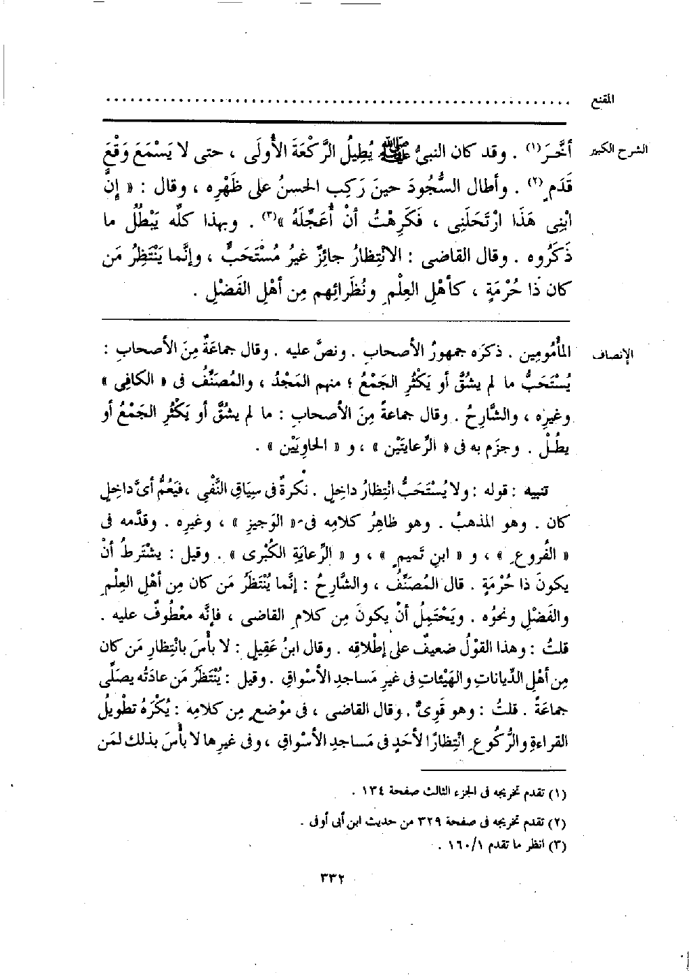 تنبيه: قوله: ولا يُسْتَحَبُّ انْتِظارُ داخِلٍ. نْكرةٌ في سِيَاقِ النَّفْي، فيَعُمُّ أيَّ داخِلٍ كان. وهو المذهبُ. وهو ظاهِرُ كلامِه في «الوَجيزِ»، وغيرِه. وقدَّمه في «الفُروعِ»، و «ابنِ تَميمٍ»، و «الرِّعايَةِ الكُبْرى». وقيل: يشْتَرطُ أنْ يكون ذا حُرْمَةٍ. قال المُصَنِّفُ، والشَّارِحُ: إنَّما يُنْتَظَرُ مَن كان مِن أهْلِ العِلْمِ والفَضْلِ ونحوُه. ويَحْتَمِلُ أنْ يكونَ مِن كلام القاضي، فإنَّه معْطوفٌ عليه. قلتُ: وهذا القوْلُ ضعيفٌ على إطْلاقِه. وقال ابنُ عَقِيلٍ: لا بأْسَ بانْتِظارِ مَن كان مِن أهْلِ الدِّياناتِ والهَيْئاتِ في غيرِ مَساجدِ الأسْواقِ. وقيل: يُنْتَظَرُ مَن عادَتُه يصَلِّي جماعَةٌ. قلت: وهو قوِيٌّ. وقال القاضي، في موضعٍ مِن كلامِه: يُكْرَهُ تطْويلُ القراءةِ والرُّكُوعَ انْتِظارًا لأحَدٍ في مَساجدِ الأسْواقِ، وفي غيرِها لا بأْسَ بذلك لمَن