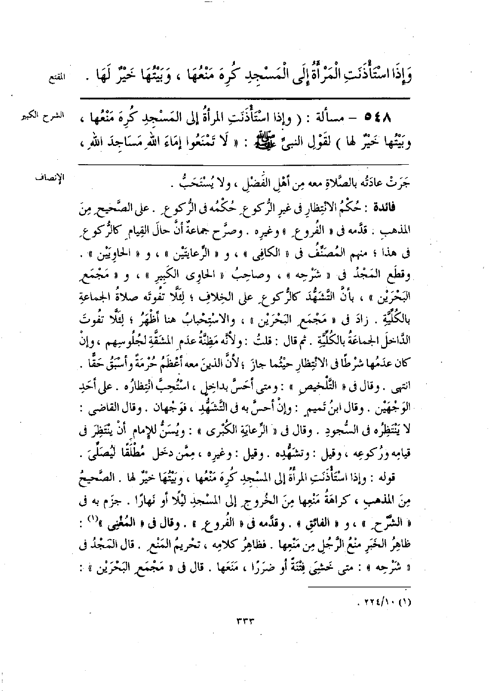 جَرَتْ عادَتُه بالصَّلاةِ معه مِن أهْلِ الفَضْلِ، ولا يُسْتَحَبُّ. فائدة: حُكْمُ الانْتِظارِ في غيرِ الرُّكوعِ حُكْمُه في الرُّكوعِ. على الصَّحيحِ مِنَ المذهبِ. قدَّمه في «الفُروعِ» وغيره. وصرَّح جماعةٌ أنَّ حالَ القِيام كالرُّكوعِ في هذا؛ منهم المُصَنِّفُ في «الكافِي»، و «الرِّعايتَيْن»، و «الحاوِيَيْن». وقطَع المَجْدُ في «شَرْحِه»، وصاحِبُ «الحاوي الكَبِيرِ»، و «مَجْمَعِ البَحْرَيْن»، بأنَّ التَّشَهُّدَ كالرُّكوعِ على الخِلافِ؛ لِئَلَّا تفُوتَه صلاةُ الجماعةِ بالكُلّيِّةِ. زادَ في «مَجْمَعِ البَحْرَيْن»، والاسْتِحْبابُ هنا أظْهَرُ؛ لِئَلَّا تفُوتَ الدَّاخل الجماعَةُ بالكُلِّيَّةِ. ثم قال: قلتُ: ولأنَّه مَظِنِّةُ عدَمِ المشَقَّةِ لجُلُوسِهم، وإنْ كان عدَمُها شرْطًا في الانْتِظارِ حيْثُما جازَ؛ لأنَّ الذينَ معه أعْظَمُ حُرْمَةً وأسْبَقُ حَقًّا. انتهى. وقال في «التَّلْخيصِ»: ومتى أحَسَّ بداخِلٍ، اسْتُحِبَّ انْتِظارُه. على أحَدِ الوَجْهَيْن. وقال ابن تَميمٍ: وإنْ أحسَّ به في التَّشَهُّدِ، فوَجْهان. وقال القاضي: لا يَنْتَظُره في السُّجودِ. وقال في «الرِّعايَةِ الكُبْرى»: ويُسَنُّ للإمام أنْ ينْتَظِرَ في قيامِه ورُكوعِه، وقيل: وتشَهُّدِه. وقيل: وغيره، مِمَّن دخل مُطْلَقًا ليُصَلِّىَ. قوله: وإذا اسْتَأْذَنَتِ المرأَةُ إلى المسْجدِ كُرِهُ مَنْعُها، وبَيْتُهَا خيْرٌ لها. الصَّحيحُ مِنَ المذهبِ، كراهَةُ مَنْعِها مِنَ الخُروجِ إلى المسْجدِ ليْلًا أو نَهارًا. جزَم به في «الشَّرْحِ»، و «الفائقِ». وقدَّمه في «الفُروعِ». وقال في «المُغْنِي» (¬1): ظاهِرُ الخَبَرِ منْعُ الرَّجُل مِن مَنْعِها. فظاهِرُ كلامِه، تحْريمُ المَنْعِ. قال المَجْدُ في «شَرْحِه»: متى خَشِيَ فِتْنَةً أو ضرَرًا، مَنَعَها. قال في «مَجْمَعِ البَحْرَيْن»: