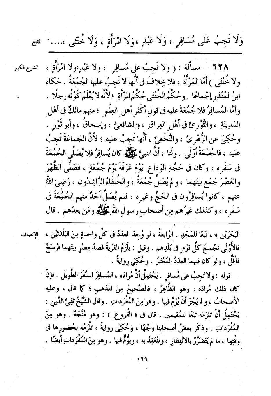 قوله: ولا تَجِبُ على مُسافرٍ. يَحْتَمِلُ أنَّ مُرادَه، المُسافِرُ السَّفَرَ الطَّويلَ. فإنْ كان ذلك مُرادَه، وهو الظَّاهِرُ، فالصَّحيحُ مِنَ المذهبِ؛ كما قال، وعليه الأصحابُ، ولم يَجُزْ أنْ يُؤمَّ فيها. وهوْ مِنَ المُفْرَداتِ. وقال الشَّيْخُ تَقِىُّ الدِّينِ: يَحْتَمِلُ أنْ تلزَمَه تبَعًا للمُقيمين. قال فى «الفُروعِ»: وهو مُتَّجَهٌ. وهو منَ المُفْرَداتِ. وذكَر بعضُ أصحابنا وجْهًا، وحُكِىَ روايةً، تلْزَمُه بحُضورِها فى وقْتِها، ما لم يتضَرَّرْ بالانتِظارِ، وتنْعَقِدُ به، ويؤمُّ فيها. وهو مِنَ المُفْرَداتِ أيضًا.
