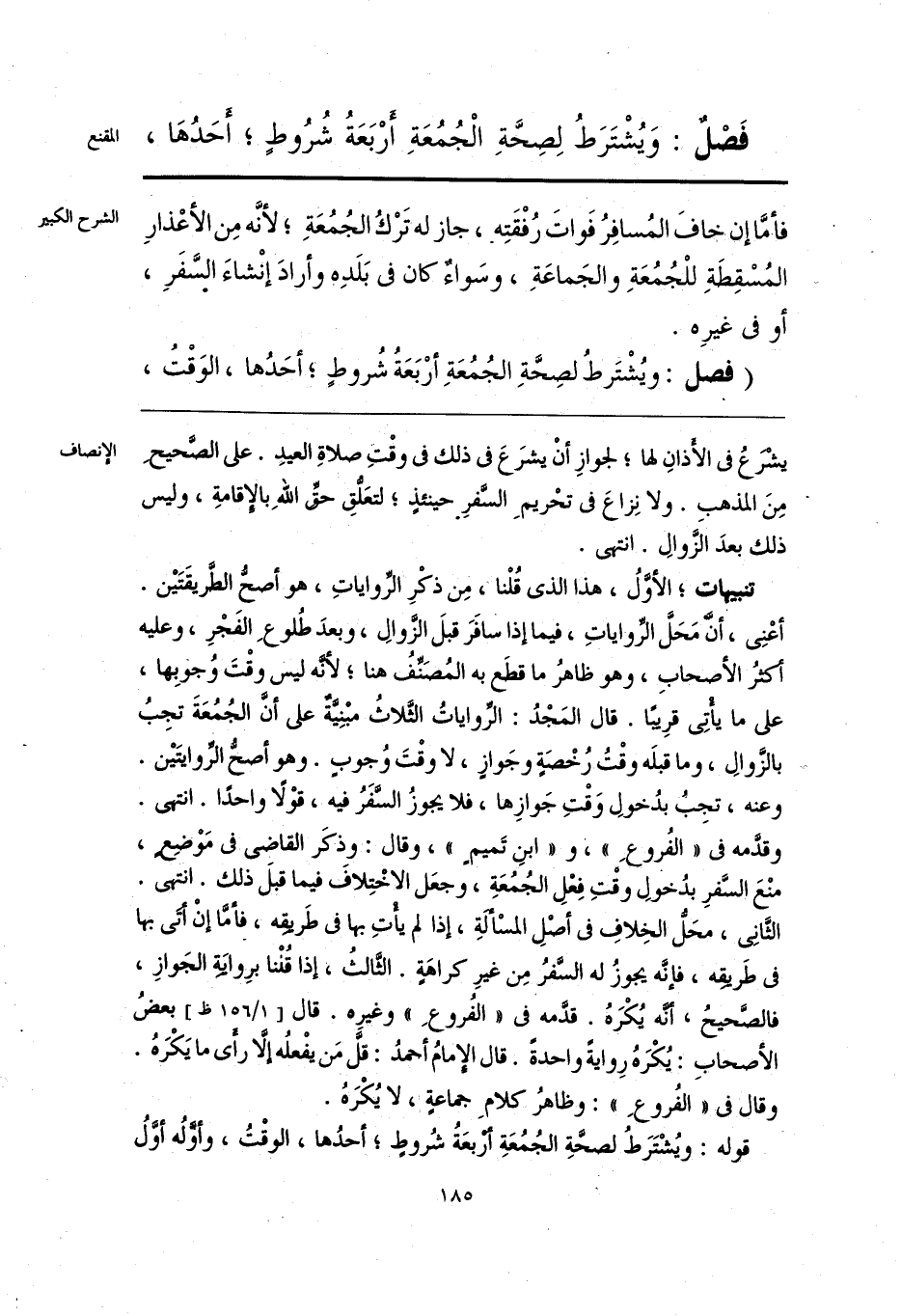 تنبيهات؛ الأوَّلُ، هذا الذى قُلْنا، مِن ذكْرِ الرِّواياتِ، هو أصحُّ الطَّريقَتَيْن. أعْنِى، أنَّ مَحَلَّ الرِّواياتِ، فيما إذا سافَرَ قبلَ الزَّوالِ، وبعدَ طُلوعِ الفَجْرِ، وعليه أكثرُ الأصحابِ، وهو ظاهرُ ما قطَع به المُصَنِّفُ هنا؛ لأنَّه ليس وقْتَ وُجوبِها، على ما يأْتِى قرِيبًا. قال المَجْدُ: الرِّواياتُ الثَّلاثُ مبْنِيَّةٌ على أنَّ الجُمُعَةَ تجِبُ بالزَّوالِ، وما قبلَه وقْتُ رُخْصَةٍ وجَوازٍ، لا وقْتَ وُجوبٍ. وهو أصحُّ الرِّوايتَيْن. وعنه، تجِبُ بدُخولِ وَقْتِ جَوازِها، فلا يجوزُ السَّفَرُ فيه، قوْلًا واحدًا. انتهى. وقدَّمه فى «الفُروعِ»، و «ابنِ تَميمٍ»، وقال: وِذكَر القاضى فى مَوْضِعٍ، منْعَ السَّفرِ بدُخولِ وقْتِ فِعْلِ الجُمُعَةِ، وجعَل الاخْتِلاف فيما قبلَ ذلك. انتهى. الثَّانِى، محَلُّ الخِلافِ فى أصْلِ المسْألَةِ، إذا لم يأْتِ بها فى طَريقِه، فأمَّا إنْ أتَى بها فى طَريقِه، فإنَّه يجوزُ له السَّفرُ مِن غيرِ كراهَةٍ. الثَّالثُ، إذا قُلْنا برِوايَةِ الجَوازِ، فالصَّحيحُ، أنَّه يُكْرَهُ. قدَّمه فى «الفُروعِ» وغيره. قال بعضُ الأصحابِ: يُكْرَهُ رِوايةً واحدةً. قال الإِمامُ أحمدُ: قَلَّ مَن يفْعلُه إلَّا رأَى ما يَكْرَهُ. وقال فى «الفُروعِ»: وظاهرُ كلامِ جماعةٍ، لا يُكْرَهُ.