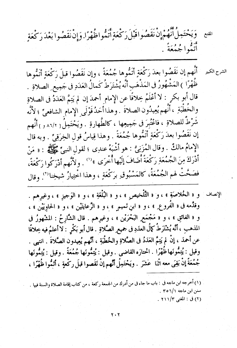 و «الخُلاصَةِ»، و «التَّلْخيصِ»، و «البُلْغَةِ»، و «الوَجيزِ»، وغيرِهم. وقدَّمه فى «الفُروعِ»، و «ابنِ تَميمٍ»، و «الرِّعايتَيْن»، و «الحاوِيَيْن»، و «الفائقِ»، و «مَجْمَعِ البَحْرَيْن»، وغيرِهم. قال الشَّارِحُ: المشْهورُ فى المذهبِ، أنَّه يُشْتَرَطُ كمالُ العدَدِ فى جميع الصَّلاةِ. قال أبو بَكْرٍ: لا أعلمُ فيه خِلافًا عن أحمدَ، إنْ لم يَتِمَّ العَدَدُ فى الصَّلاةِ والخُطْبَةِ، أنَّهم يُعِيدون الصَّلاةَ. انتهى. وفيل: يُتِمُّونَها ظُهْرًا. اخْتارَه القاضى. وقيل: يُتِمُّونَها جُمُعَةً. وقيل: يُتِمُّونَها جُمُعَةً إنْ بَقِىَ معه اثْنَا عشَرَ. ويَحْتَمِلُ أنَّهم إنْ نَقَصوا قبلَ ركْعةٍ، أتَمُّوا ظُهْرًا،