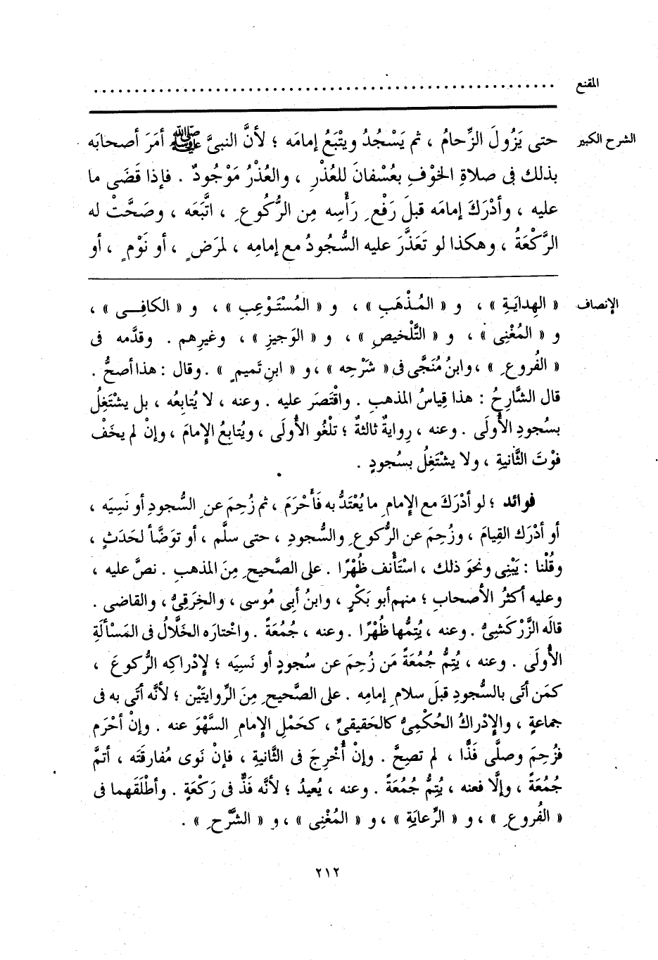 «الهِديَةِ»، و «المُذْهَبِ»، و «المُسْتَوْعِبِ»، و «الكافِى»، و «المُغْنِى»، و «التَّلْخيصِ»، و «الوَجيزِ»، وغيرِهم. وقدَّمه فى «الفُروعَ»، وابنُ مُنَجَّى فى «شَرْحِه»، و «ابنِ تَميمٍ». وقال: هذا أصحُّ. قال الشَّارِحُ: هذا قِياسُ المذهبِ. واقْتَصَر عليه. وعنه، لا يُتابِعُه، بل يشْتَغِلُ بسُجودِ الأُولَى. وعنه، رِوايةٌ ثالثةٌ؛ تلْغُو الأُولَى، ويُتابعُ الإِمامَ، وإنْ لم يخَفْ فوْتَ الثَّانيةِ، ولا يشْتَغِلُ بسُجودٍ.