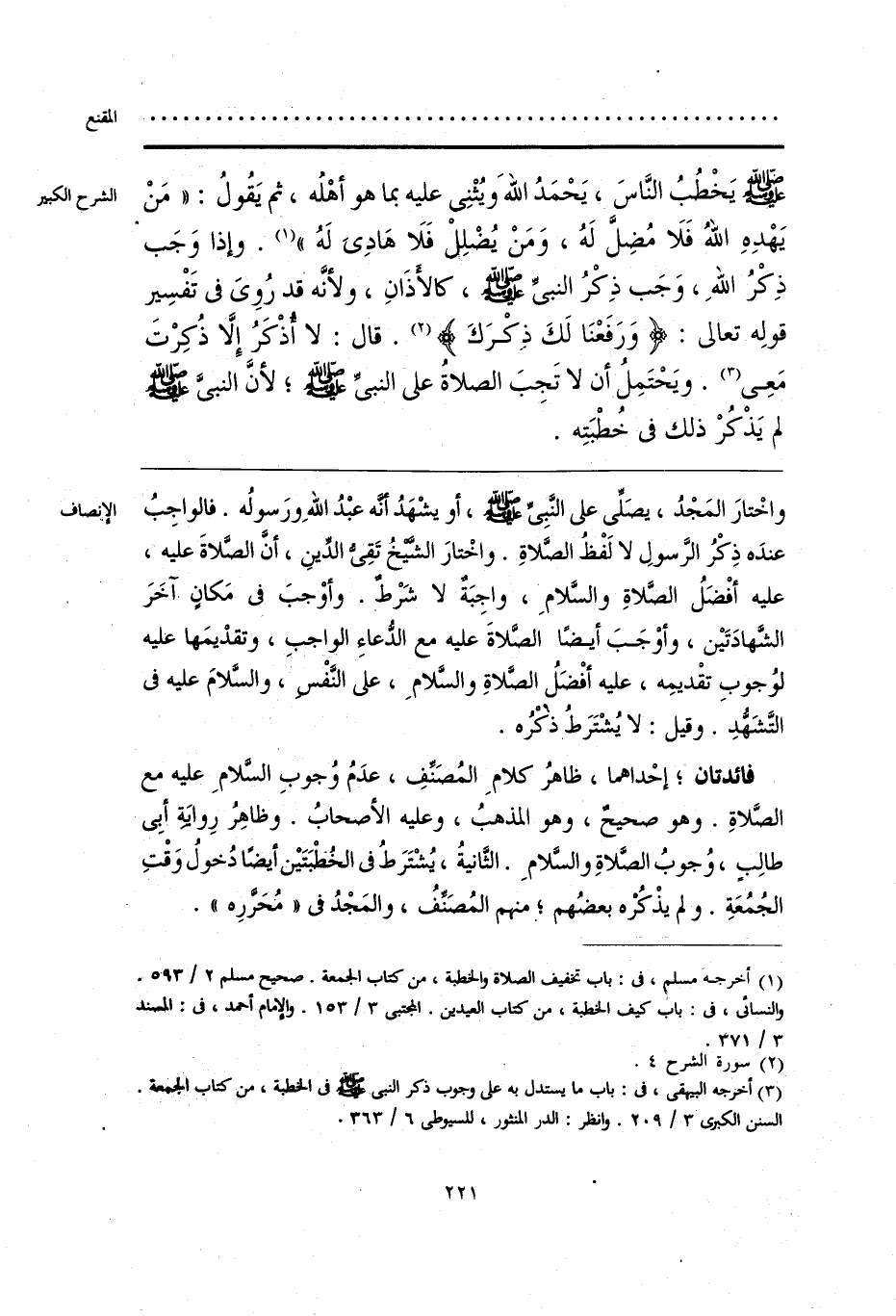 فائدتان؛ إحْداهما، ظاهرُ كلامِ المُصَنِّفِ، عدَمُ وُجوبِ السَّلامِ عليه مع الصَّلاةِ. وهو صحيحٌ، وهو المذهبُ، وعليه الأصحابُ. وظاهِرُ رِوايَةِ أبِى طالِبٍ، وُجوبُ الصَّلاةِ والسَّلامِ. الثَّانيةُ، يُشْتَرَطُ فى الخُطْبَتَيْن أيضًا دُخولُ وَقْتِ الجُمُعَةِ. ولم يذْكُرْه بعضُهم؛ منهم المُصَنفُ، والمَجْدُ فى «مُحَرَّرِه».