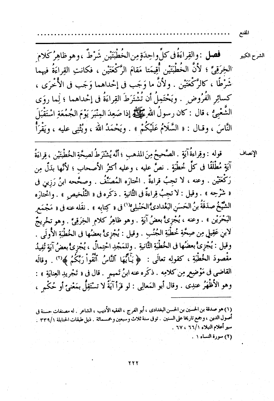 قوله: وقِراءةُ آيَةِ. الصَّحيحُ مِنَ المذهبِ؛ أنَّه يُشْتَرَطُ لصِحَّةِ الخُطْبْتَيْن، قِراءَةُ آيَةٍ مُطْلَقًا فى كلِّ خُطْبَةٍ. نصَّ عليه، وعليه أكثرُ الأصحابِ؛ لأنَّها بدَلٌ مِن رَكْعَتَيْن. وعنه، لا تجِبُ قراءةٌ. اخْتارَه المُصَنِّفُ. وصحَّحه ابنُ رَزِينٍ فى «شَرْحِه». وقيل: لا تجِبُ قِراءةٌ فى الثَّانيةِ. ذكَره فى «التَّلْخيصِ». واخْتارَه الشَّيْخُ صدَقَةُ بنُ الحَسَنِ البَغْدادىُّ الحَنْبلِىُّ (¬1) فى «كِتابِه». نقَله عنه فى «مَجْمَعِ البَحْرَيْن». وعنه، يُجْزِيُّ بعضُ آيَةِ. وهو ظاهِرُ كلامِ الخِرَقِىِّ. وهو تخْرِيجٌ لابنِ عَقِيلٍ مِن صِحَّةِ خُطْبَةِ الجُنُبِ. وقيل: يُجْزِئُ بعضُها فى الخُطْبَةِ الأُولَى. وقيل: يُجْزِئُ بعضها فى الخُطْبَةِ الثَّانيةِ. وللمَجْدِ احْتِمالٌ، يُجْزِئُ بعضُ آيَةٍ تُفِيدُ مقْصودَ الخُطْبَةِ، كقولِه تعالَى: {يَاأَيُّهَا الْنَّاسُ اتَّقُواْ رَبَّكُمُ} (¬2). وقالَه القاضى فى مَوْضِعٍ مِنْ كلامِه. ذكَره عنه ابنُ تَميمٍ. قال فى «تَجْريدِ العِنايَةِ»: وهو الأَظْهَرُ عندِى. وقال أبو المَعالِى: لو قرَأ آيَةً لا تسْتَقِلُّ بمَعْنًى أو حُكْمٍ،