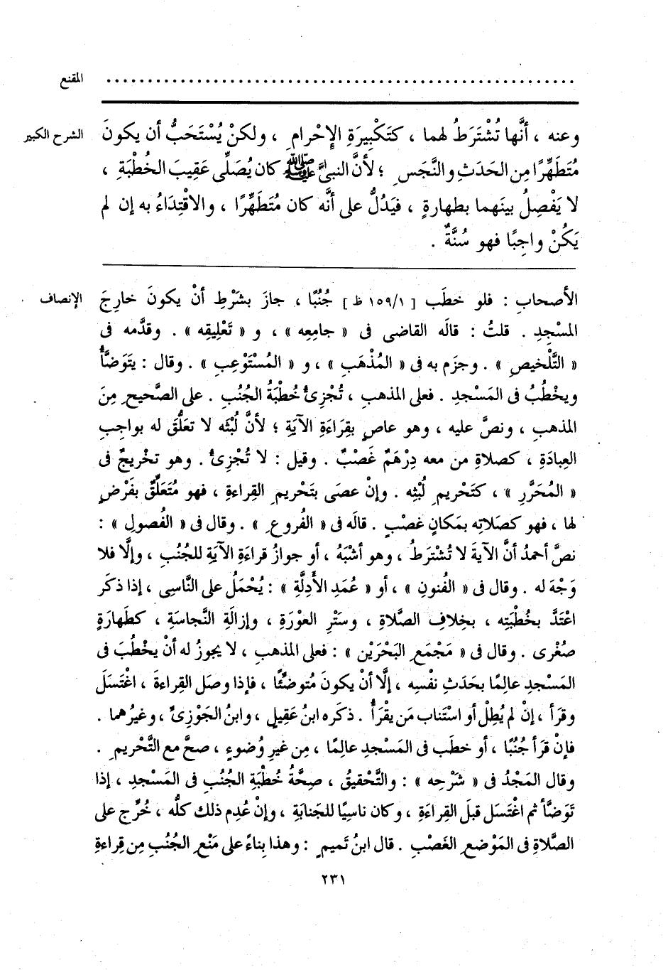 الأصحابِ: فلو خطَب جُنُبًا. جازَ بشَرْطِ أنْ يكونَ خارِجَ المسْجِدِ. قلتُ: قالَه القاضى فى «جامِعِه»، و «تَعْلِيقِه». وقدَّمه فى «التَّلْخيصِ». وجزَم به فى «المُذْهَبِ»، و «المُسْتَوْعِبِ». وقال: يتَوَضَّأُ ويخْطُبُ فى المَسْجدِ. فعلى المذهبِ، تُجْزِئُ خُطْبَةُ الجُنُبِ. على الصَّحيحِ مِنَ المذهبِ، ونصَّ عليه، وهو عاصٍ بقِرَاءَةِ الآيَةِ؛ لأنَّ لُبْثَه لا تعَلُّقَ له بواجِبِ العِبادَةِ، كصلاةِ من معه دِرْهَمٌ غَصْبٌ. وقيل: لا تُجْزِئُ. وهو تخْريجٌ فى «المُحَرِّرِ»، كتَحْريمِ لُبْثِه. وإنْ عصَى بتَحْريمِ القِراءةِ، فهو مُتَعَلِّقٌ بفَرْضٍ لها، فهو كصَلاِته بمَكانٍ غصْبٍ. قالَه فى «الفُروعِ». وقال فى «الفُصولِ»: نصَّ أحمدُ أنَّ الآيةَ لا تُشْترَطُ، وهو أشْبَهُ، أو جوازُ قراءَةِ الآيَةِ للجُنُبِ، وإلَّا فلا وَجْهَ له. وقال فى «الفُنونِ»، أو «عُمَدِ الأدِلَّةِ»: يُحْمَلُ على النَّاسِى، إذا ذكَر اعْتَدَّ بخُطْبَتِه، بخِلافِ الصَّلاةِ، وسَتْرِ العوْرَةِ، وإزالَةِ النَّجاسَةِ، كطَهارَةٍ صُغْرى. وقال فى «مَجْمَعِ البَحْرَيْن»: فعلى المذهبِ، لا يجوزُ له أنْ يخْطُبَ فى المَسْجدِ عالِمًا بحَدَثِ نفْسِه، إلَّا أنْ يكونَ مُتوضِّئًا، فإذا وصَل القِراءةِ، اغْتَسَلَ وقرَأ، إنْ لم يُطِلْ أو اسْتَناب مَن يقْرأُ. ذكَره ابنُ عَقِيل، وابنُ الجَوْزِىِّ، وغيرُهما. فإنْ قرَأ جُنُبًا، أو خطَب فى المَسْجدِ عالِمًا، مِن غيرِ وُضوءٍ، صحَّ مع التَّحْريمِ. وقال المَجْدُ فى «شَرْحِه»: والتَّحْقيقُ، صِحَّةُ خُطْبَةِ الجُنُبِ فى المَسْجدِ، إذا تَوَضَّأ ثم اغْتَسَل قبلَ القِراءَةِ، وكان ناسِيًا للجَنابَةِ، وإنْ عُدِم ذلك كلُّه، خُرِّج على الصَّلاةِ فى المَوْضع الغَصْبِ. قال ابنُ تَميمٍ: وهذا بِناءً على مَنْع الجُنُبِ مِن قِراءةِ