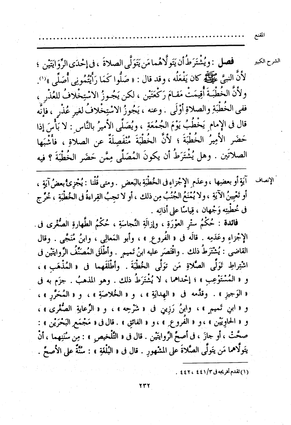 فائدة: حُكْمُ ستْرِ العوْرَةِ، وإزالَةِ النَّجاسَةِ، حُكْمُ الطَّهارةِ الصُّغْرى فى الإجْزاءِ وعَدَمِه. قالَه فى «الفُروعِ»، وأبو المَعالِى، وابنُ مُنَجَّى. وقال القاضى: يُشْتَرَطُ ذلك. واقْتَصَر عليه ابنُ تَميمٍ. وأطْلَقَ المُصَنِّفُ الرِّوايتَيْن فى اشْتِراطِ تَوَلِّى الصَّلاةِ مَن توَلَّى الخُطْبَةَ. وأطْلَقَهما فى «المُذْهَبِ»، و «المُسْتَوْعِبِ»؛ إحْداهما، لا يُشْتَرَطُ ذلك. وهو المذهبُ. جزَم به فى «الوَجيزِ». وقدَّمه فى «الهِدايَةِ»، و «الخُلاصَةِ»، و «المُحَرَّرِ»، و «ابنِ تَميمٍ»، وابنُ رَزِينٍ فى «شَرْحِه»، و «الرِّعايَةِ الصُّغْرى»، و «الحاوِيَيْن»، و «الفُروعِ»، و «الفائقِ». قال فى «مَجْمَعِ البَحْرَيْن»: صحَّتْ، أو جازَ، فى أصحِّ الرِّوايتَيْن. قال فى «التَّلْخيصِ»: من سُنَنِهما، أنْ يتَولَّاهما مَن يتَولَّى الصَّلاةَ على المشْهورِ. قالِ فى «البُلْغَةِ»: سُنَّة على الأصحِّ.
