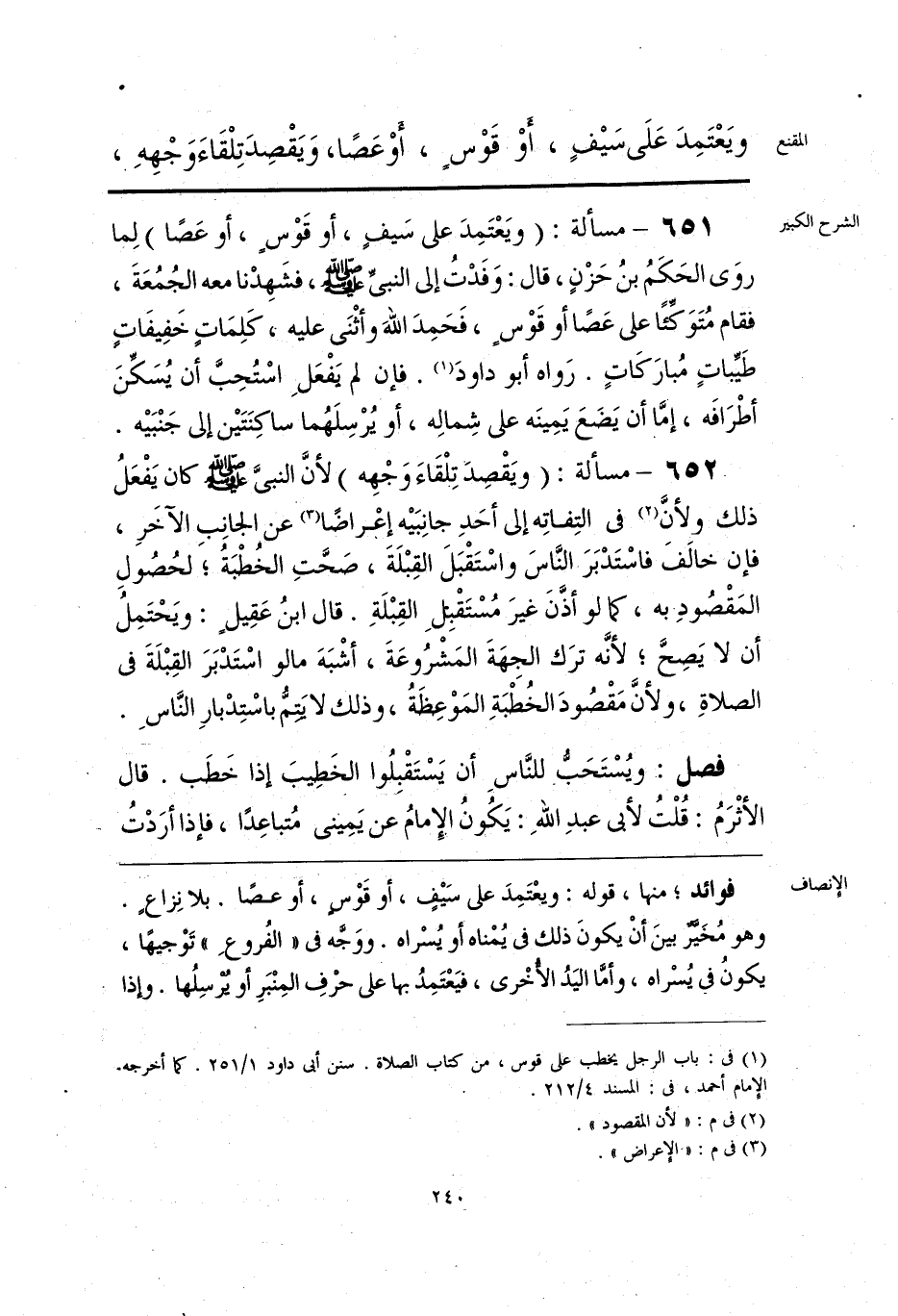 فوائد؛ منها، قوله: ويعْتَمِدَ على سَيْفٍ، أو قَوْسٍ، أو عصًا. بلا نِزاعٍ. وهو مُخَيَّرٌ بينَ أنْ يكونَ ذلك فى يُمْناه أو يُسْراه. ووَجَّه فى «الفُروعِ» تَوْجيهًا، يكونُ فى يُسْراه، وأمَّا اليَدُ الأُخْرى، فيَعْتَمِدُ بها على حرْفِ المِنْبَرِ أو يُرْسِلُها. وإذا