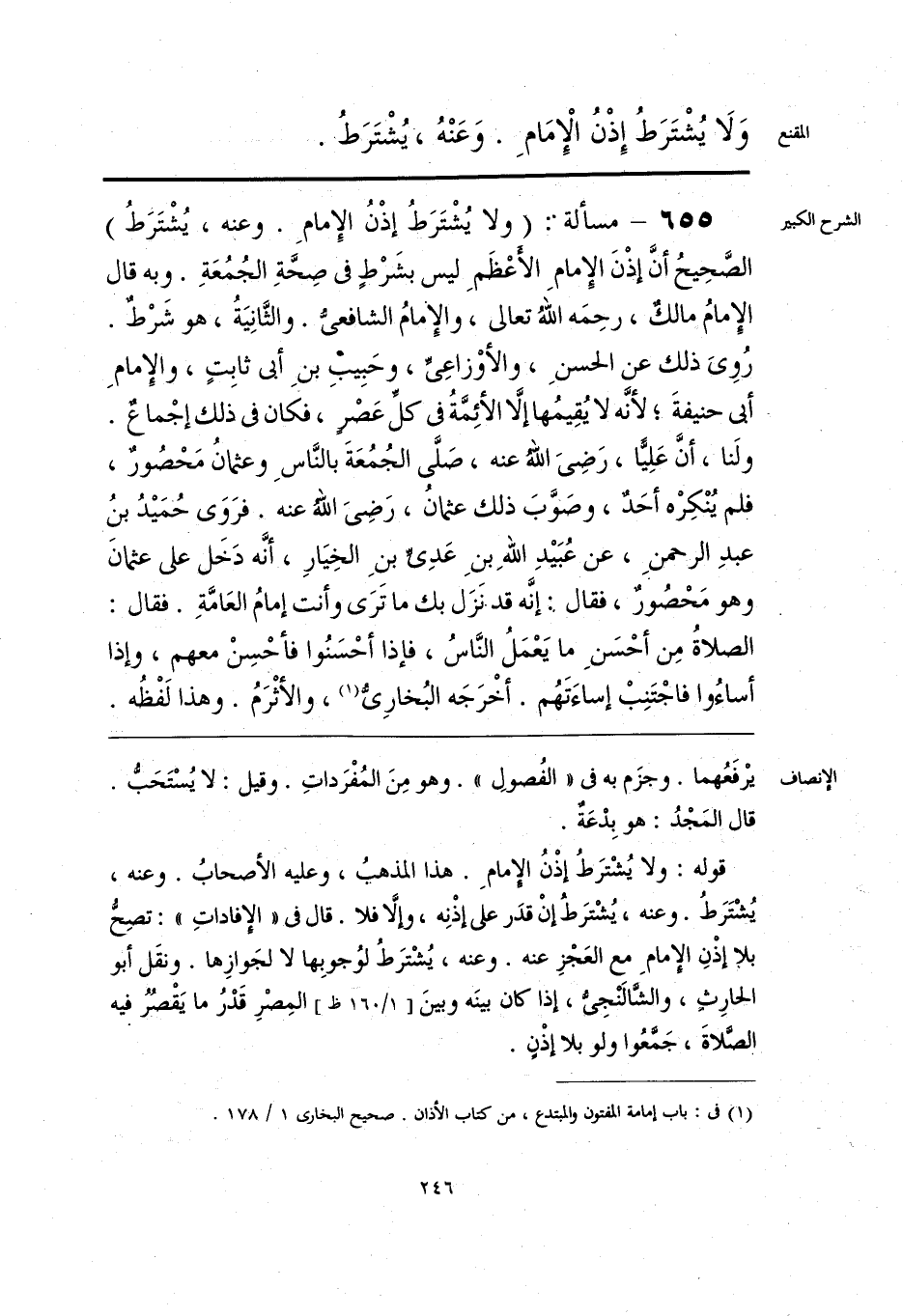 قوله: ولا يُشْترَطُ إذْنُ الإِمامِ. هذا المذهبُ، وعليه الأصحابُ. وعنه، يُشْتَرَطُ. وعنه، يُشْتَرطُ إنْ قدَر على إذْنِه، وإلَّا فلا. قال فى «الإِفاداتِ»: تصِحُّ بلا إذْنِ الإِمامِ مع العَجْزِ عنه. وعنه، يُشْترَطُ لوُجوبِها لا لجَوازِها. ونقَل أبو الحارِث، والشَّالَنْجِىُّ، إذا كان بينَه وبينَ المِصْرِ قَدْرُ ما يَقْصُرُ فيه الصَّلاةَ، جَمَّعُوا ولو بلا إذْنٍ.