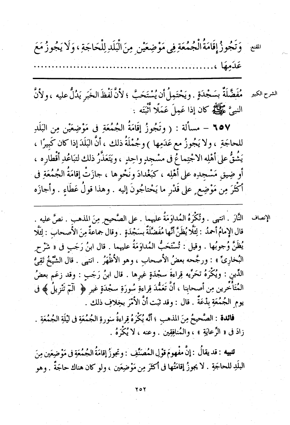 تنبيه: قد يقالُ: إنَّ مفْهومَ قوْلِ المُصَنِّفِ: وتجوزُ إقامَةُ الجُمُعَةِ فى مَوْضِعَين مِنَ البلَدِ للحاجَةِ. لا يجوزُ إقامَتُها فى أكْثَرَ مِن مَوْضِعَين، ولو كان هناك حاجَةٌ. وهو