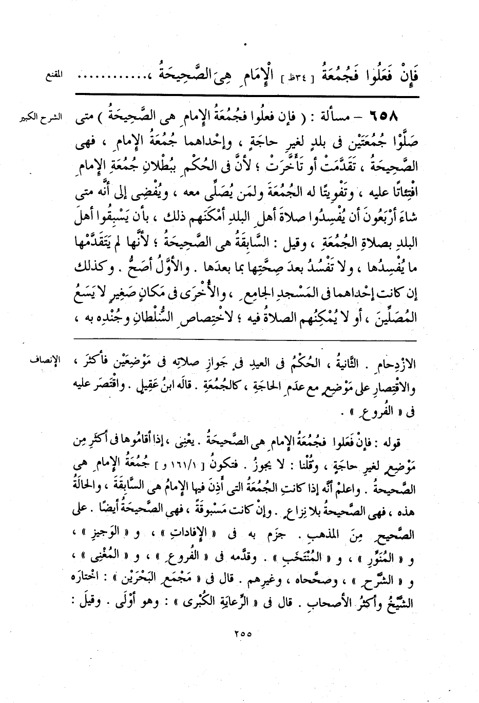 قوله: فإنْ فَعَلوا فجُمُعَةُ الإِمامِ هى الصَّحيحَةُ. يعْنِى، إذا أقامُوها فى أكثَرِ مِن مَوْضِعٍ لغيرِ حاجَةٍ، وقُلْنا: لا يجوزُ. فتكونُ جُمُعَةُ الإِمامِ هى الصَّحيحةُ. واعلمْ أنَّه إذا كانتِ الجُمُعَةُ التى أَذِنَ فيها الإِمامُ هى السَّابِقَةَ، والحالَةُ هذه، فهى الصَّحيحةُ بلا نِزاعٍ. وإنْ كانت مَسْبوقَةً، فهى الصَّحيحَةُ أيضًا. على الصَّحيحِ مِنَ المذهبِ. جزَم به فى «الإِفاداتِ»، و «الوَجيزِ»، و «المُنَوِّرِ»، و «المُنْتَخَبِ». وقدَّمه فى «الفُروعِ»، و «المُغْنِى»، و «الشَّرْحِ»، وصحَّحاه، وغيرِهم. قال فى «مَجْمَعِ البَحْرَيْن»: اخْتارَه الشَّيْخُ وأكثرُ الأصحابِ. قال فى «الرِّعايَةِ الكُبْرى»: وهو أوْلَى. وقيلَ: