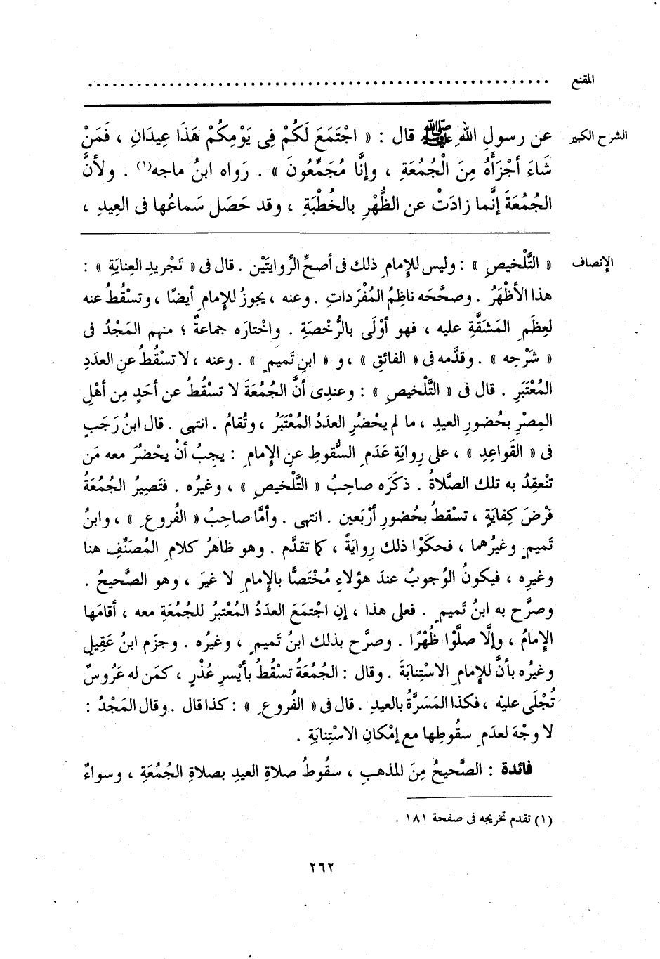فائدة: الصَّحيحُ مِنَ المذهبِ، سقُوطُ صلاةِ العيدِ بصلاةِ الجُمُعَةِ، وسواءٌ