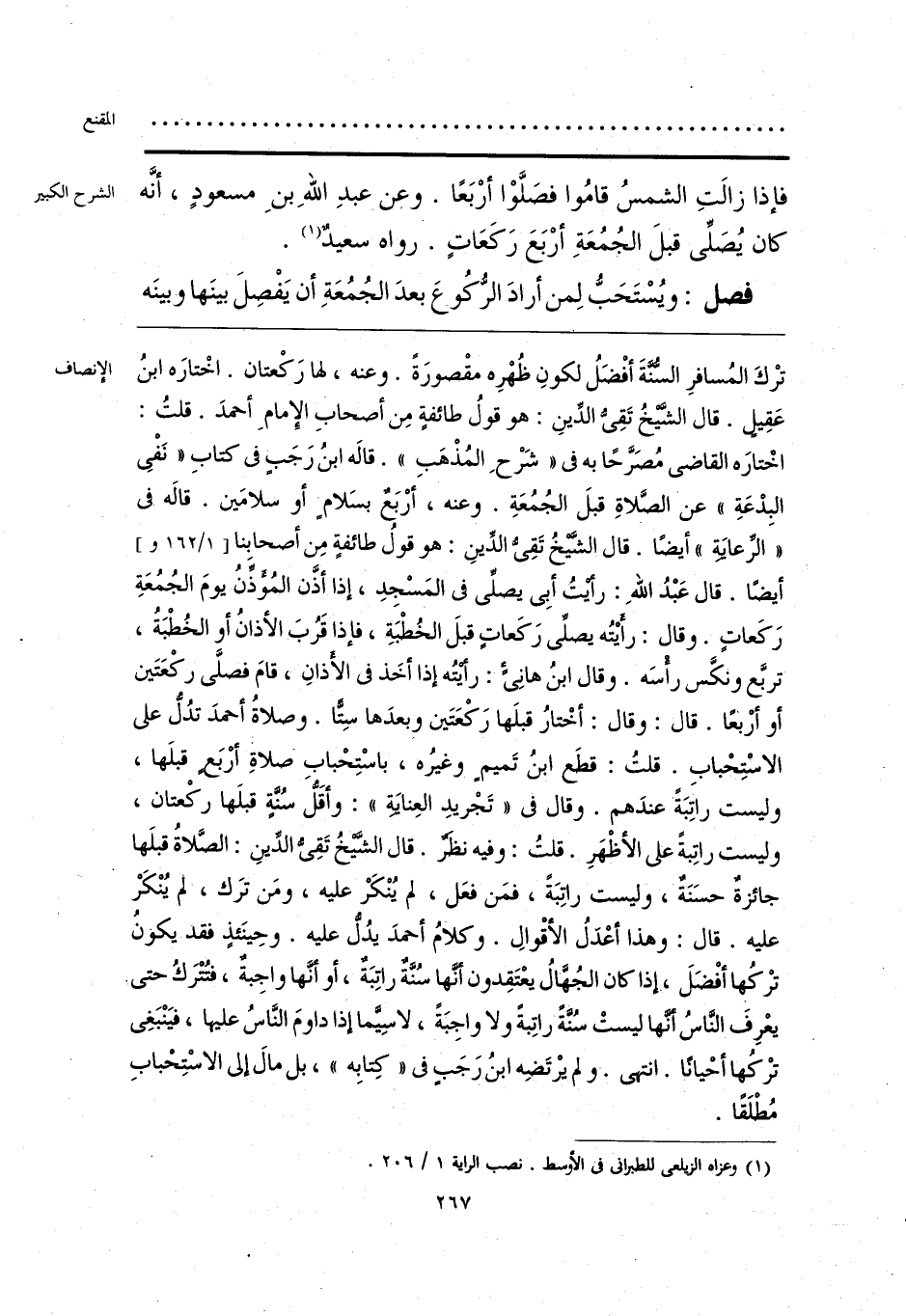تْركَ المُسافرِ السُّنَّةَ أفْضَلُ لكونِ ظُهْرِه مقْصورَةً. وعنه، لها رَكْعتان. اخْتارَه ابنُ عَقِيلٍ. قال الشَّيْخُ تَقِىُّ الدِّينِ: هو قولُ طائفةٍ مِن أصحابِ الإِمامِ أحمدَ. قلتُ: اخْتارَه القاضى مُصَرَّحًا به فى «شَرْحِ المُذْهَبِ». قالَه ابنُ رَجَبٍ فى كتابِ «نَفْى البِدْعَةِ» عن الصَّلاةِ قبلَ الجُمُعَةِ. وعنه، أرْبَعٌ بسَلامٍ أو سلامَين. قالَه فى «الرِّعايَةِ» أيضًا. قال الشَّيْخُ تَقِىُّ الدِّينِ: هو قولُ طائفةٍ مِن أصحابِنا أيضًا. قال عَبْدُ اللَّهِ: رأيْتُ أبِى يصلِّى فى المَسْجِدِ، إذا أذَّن المُؤَذِّنُ يومَ الجُمُعَةِ رَكَعاتٍ. وقال: رأَيْتُه يصلِّى رَكَعاتٍ قبلَ الخُطْبَةِ، فإذا قَرُبَ الأذانُ أو الخُطْبَةُ، تربَّع ونكَّس رأْسَه. وقال ابنُ هانِئٍ: رأيْتُه إذا أخَذ فى الأَذانِ، قامَ فصلَّى ركْعَتَين أو أرْبعًا. قال: وقال: أخْتارُ قبلَها رَكْعَتَين وبعدَها سِتًّا. وصلاةُ أحمدَ تدُلُّ على الاسْتِحْبابِ. قلتُ: قطَع ابنُ تَميمٍ وغيرُه، باسْتِحْبابِ صلاةِ أرْبَعٍ قبلَها، وليست راتِبَةً عندَهم. وقال فى «تَجْريدِ العِنايَةِ»: وأقَلُّ سُنَّةٍ قبلَها ركْعتان، وليست راتِبةً على الأظْهَرِ. قلتُ: وفيه نظَرٌ. قال الشَّيْخُ تَقِىُّ الدِّينِ: الصَّلاةُ قبلَها جائزةٌ حسَنَةٌ، وليست راتِبَةً، فمَن فعَل، لم يُنْكَرْ عليه، ومَن ترَك، لم يُنْكَرْ عليه. قال: وهذا أعْدَلُ الأقْوالِ. وكلامُ أحمدَ يدُلُّ عليه. وحِينَئذٍ فقد يكونُ ترْكُها أفْضَلَ، إذا كان الجُهَّالُ يعْتَقِدون أنَّها سُنَّةٌ راتِبَةٌ، أو أنَّها واجِبةٌ، فتُتْرَكُ حتى يعْرِفَ النَّاسُ أنَّها ليستْ سُنَّةً راتِبةً ولا واجِبَةً، لا سِيَّما إذا داومَ النَّاسُ عليها، فيَنْبَغِى ترْكُها أحْيانًا. انتهى. ولم يرْتَضِه ابنُ رَجَبٍ فى «كِتابِه»، بل مالَ إلى الاسْتِحْبابِ مُطْلَقًا.