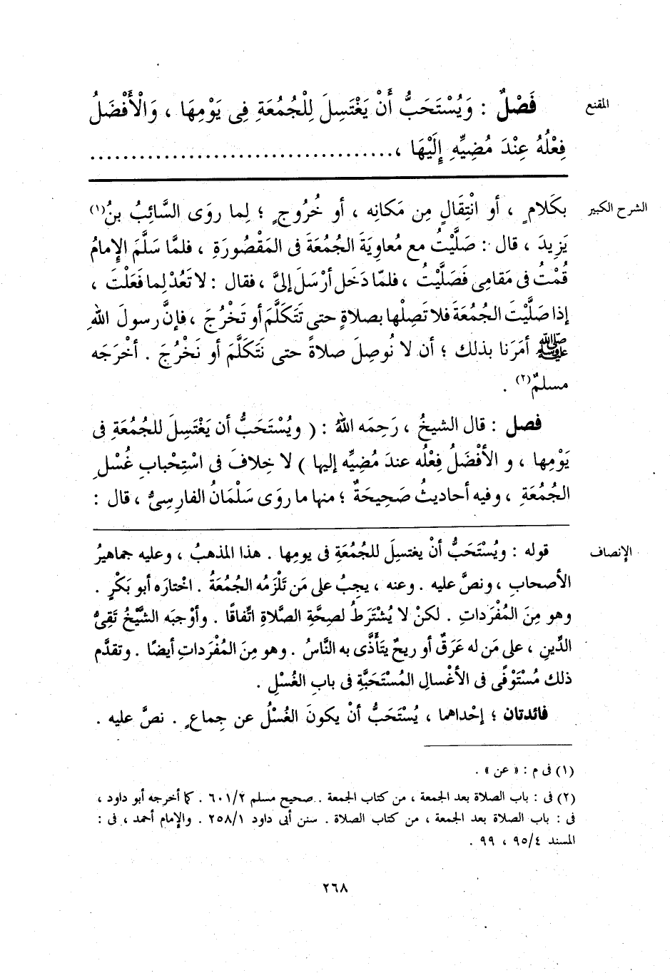 قوله: ويُسْتَحَبُّ أنْ يغتسِلَ للجُمُعَةِ فى يومِها. هذا المذهبُ، وعليه جماهيرُ الأصحابِ، ونصَّ عليه. وعنه، يجِبُ على مَن تَلْزَمُه الجُمُعَةُ. اخْتارَه أبو بَكْرٍ. وهو مِنَ المُفْرَداتِ. لكنْ لا يُشْتَرَطُ لصِحَّةِ الصَّلاةِ اتِّفاقًا. وأوْجبَه الشَّيْخُ تَقِىُّ الدِّينِ، على مَن له عَرَقٌ أو ريحٌ يتَأَذَّى به النَّاسُ. وهو مِنَ المُفْرَداتِ أيضًا. وتقدَّم ذلك مُسْتَوْفًى فى الأغْسالِ المُسْتَحَبَّةِ فى بابِ الغُسْلِ.