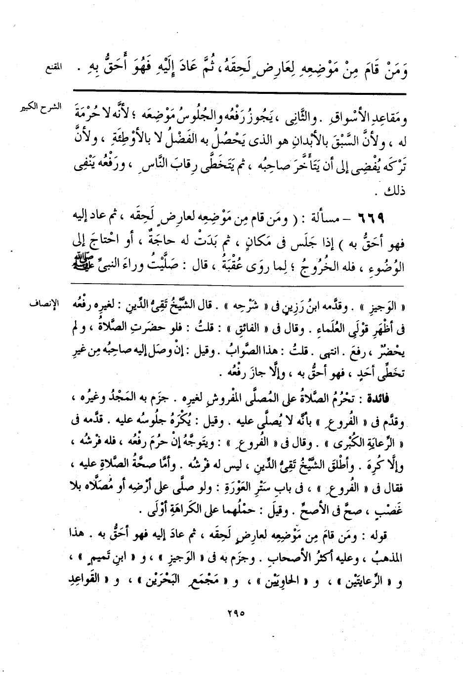قوله: ومَن قامَ مِن مَوْضِعِه لعارِضٍ لَحِقَه، ثم عادَ إليه فهو أحَقُّ به. هذا المذهبُ، وعليه أكثرُ الأصحابِ. وجزَم به فى «الوَجيزِ»، و «ابنِ تَميمٍ»، و «الرِّعايتَيْن»، و «الحاوِيَيْن»، و «مَجْمَع البَحْرَيْن»، و «القَواعِدِ