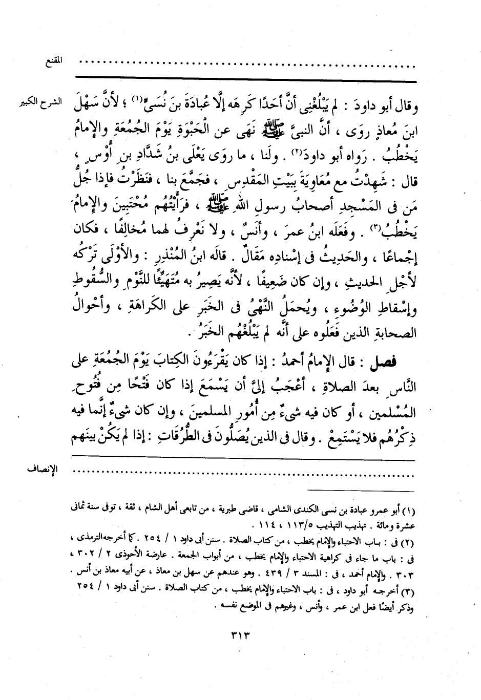 وقال أبو داودَ: لم يَبْلُغْنِى أنَّ أحَدًا كَرِهَه إلَّا عُبادَةَ بنَ نُسَىٍّ (¬1)؛ لأنَّ سَهْلَ ابنَ مُعاذٍ روَى، أنَّ النبىَّ -صلى اللَّه عليه وسلم- نَهَى عن الْحَبْوَةِ يَوْمَ الجُمُعَةِ والإِمامُ يَخْطُبُ. رَواه أبو داودَ (¬2). ولَنا، ما روَى يَعْلَى بنُ شَدَّادِ بنِ أوْسٍ، قال: شَهِدْتُ مع مُعَاوِيَةَ بِبَيْتِ المَقْدِسِ، فجَمَّعَ بنا، فنَظَرْتُ فإذا جُلُّ مَن في المَسْجِدِ أصحابُ رسولِ اللَّهِ -صلى اللَّه عليه وسلم-، فرَأَيْتُهُم مُحْتَبِينَ والإِمامُ يَخْطُبُ (¬3). وفَعَلَه ابنُ عمرَ، وأنَسٌ، ولا نَعْرِفُ لهما مُخالِفًا، فكان إجْماعًا، والحَدِيثُ في إسْنادِه مَقَالٌ. قالَه ابنُ المُنْذِرِ: والأَوْلَى تَرْكُه لأجْلِ الحديثِ، وإن كان ضَعِيفًا، لأنَّه يَصِيرُ به مُتَهَيِّئًا للنَّوْمِ والسُّقُوطِ وإسْقاطِ الوُضُوءِ، ويُحمَلُ النَّهْىُ في الخَبَرِ على الكَراهَةِ، وأحْوالُ الصحابةِ الذين فَعَلُوه على أنَّه لم يَبْلُغْهُم الخَبَرُ.