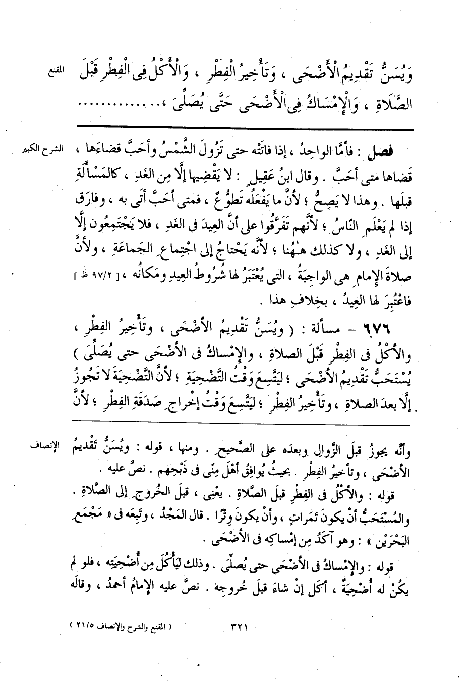قوله: والإمْساكُ فى الأضْحَى حتى يُصلِّىَ. وذلك ليَأْكُلَ مِن أُضحِيَتِه، فلو لم يكُنْ له أُضْحِيَةٌ، أكَل إنْ شاءَ قبلَ خُروجِه. نصَّ عليه الإِمامُ أحمدُ، وقالَه