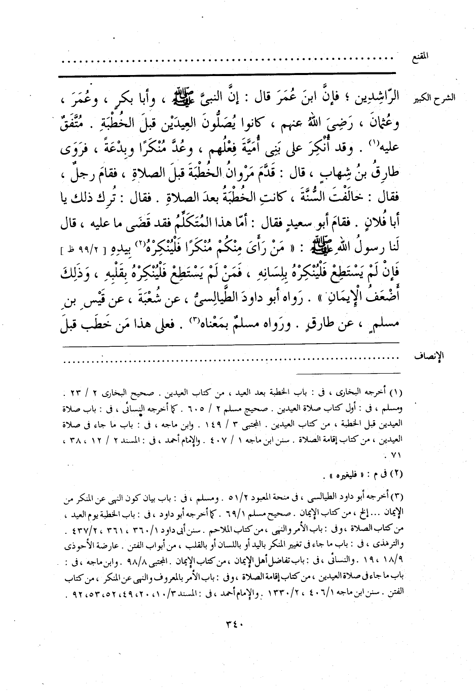 الرّاشِدِين؛ فإنَّ ابنَ عُمَرَ قال: إنَّ النبىَّ -صلى اللَّه عليه وسلم-، وأبا بكرٍ، وعُمَرَ، وعُثمانَ، رَضِىَ اللَّهُ عنهم، كانوا يُصَلّونَ العِيدَيْن قبلَ الخُطْبَةِ. مُتَّفقٌ عليه (¬1). وقد أُنْكِرَ على بَنِى أُمَيَّةَ فِعْلُهم، وعُدَّ مُنْكَرًا وبِدْعَةً، فرَوَى طارِقُ بنُ شِهابٍ، قال: قَدَّمَ مَرْوانُ الخُطْبَةَ قبلَ الصَّلاةِ، فقامَ رجلٌ، فقال: خالَفْتَ السُّنَّةَ، كانتِ الخُطْبَةُ بعدَ الصَّلاةِ. فقال: تُرِك ذلك يا أبا فُلانٍ. فقامَ أبو سعيدٍ فقال: أمّا هذا المُتَكَلِّمُ فقد قَضَى ما عليه، قال لَنا رسولُ اللَّهِ -صلى اللَّه عليه وسلم-: «مَنْ رَأىَ مِنْكُمْ مُنْكَرًا فَلْيُنْكِرْهُ (¬2) بِيدِهِ فَإنْ لَمْ يَسْتَطِعْ فَلْيُنْكِرْهُ بِلِسَانِهِ، فَمَنْ لَمْ يَسْتَطِعْ فَلْيُنْكِرْهُ بِقَلْبِهِ، وَذَلِكَ أضْعَفُ الإيمَانِ». رَواه أبو داودَ الطَّيالِسىّ، عن شُعْبَةَ، عن قَيْصرِ بنِ مسلمٍ، عن طارقٍ. ورَواه مسلمٌ بمَعْناه (¬3). فعلى هذا مَن خَطَب قبلَ