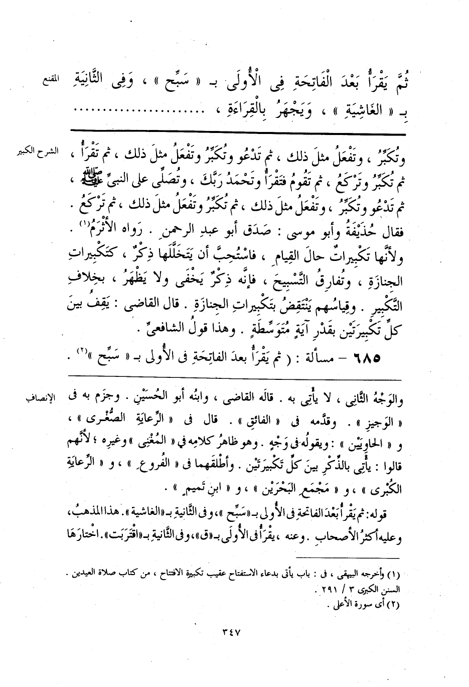 ثُمَّ يَقْرا بَعْدَ الْفَاتِحَةِ فِى الأولَىْ بـ «سَبِّح»، وَفِى الثَّانِيَةِ بِـ «الغَاشِيَةِ»، وَيَجْهَرُ بِالْقِرَاءَةِ،