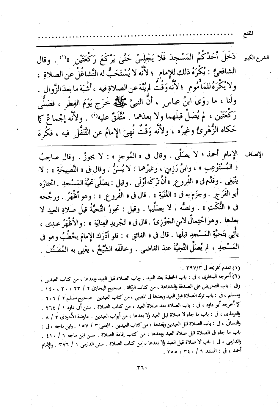 الإِمامِ أحمدَ، لا يصَلِّى. وقال فى «المُوجزِ»: لا يجوزُ. وقال صاحِبُ «المُسْتَوْعِبِ»، وابنُ رَزِين، وغيرُهما: لا يُسَنُّ. وقال فى «النَّصِيحَةِ»: لا ينْبَغِى. وقدَّم فى «الفُروعِ» أنَّ ترْكَه أوْلَى. وقيل: يصَلِّى تحيَّةَ المَسْجدِ. اخْتارَه أبو الفَرَجِ. وجزَم به فى «الغُنْيَةِ». قال فى «الفُروعِ»: وهو أظْهَرُ. ورجَّحه فى «النُّكَتِ». ونصُّه، لا يصَلِّيها. وقيل: تجوزُ التَّحيَّةُ قبلَ صلاةِ العيدِ لا بعدَها. وهو احْتِمالٌ لابنِ الجَوْزِىِّ. قال فى «تَجْريدِ العِنايَةِ»: والأظْهَرُ عندِى، يأْتِى بتَحيَّةِ المَسْجدِ قبلَها. قال فى «الفائقِ»: فلو أدْرَك الإِمامَ يخْطُبُ وهو فى المَسْجدِ، لم يُصَلِّ التَّحِيَّةَ عندَ القاضى. وخالَفَه الشَّيْخُ، يعْنِى به المُصَنِّف.