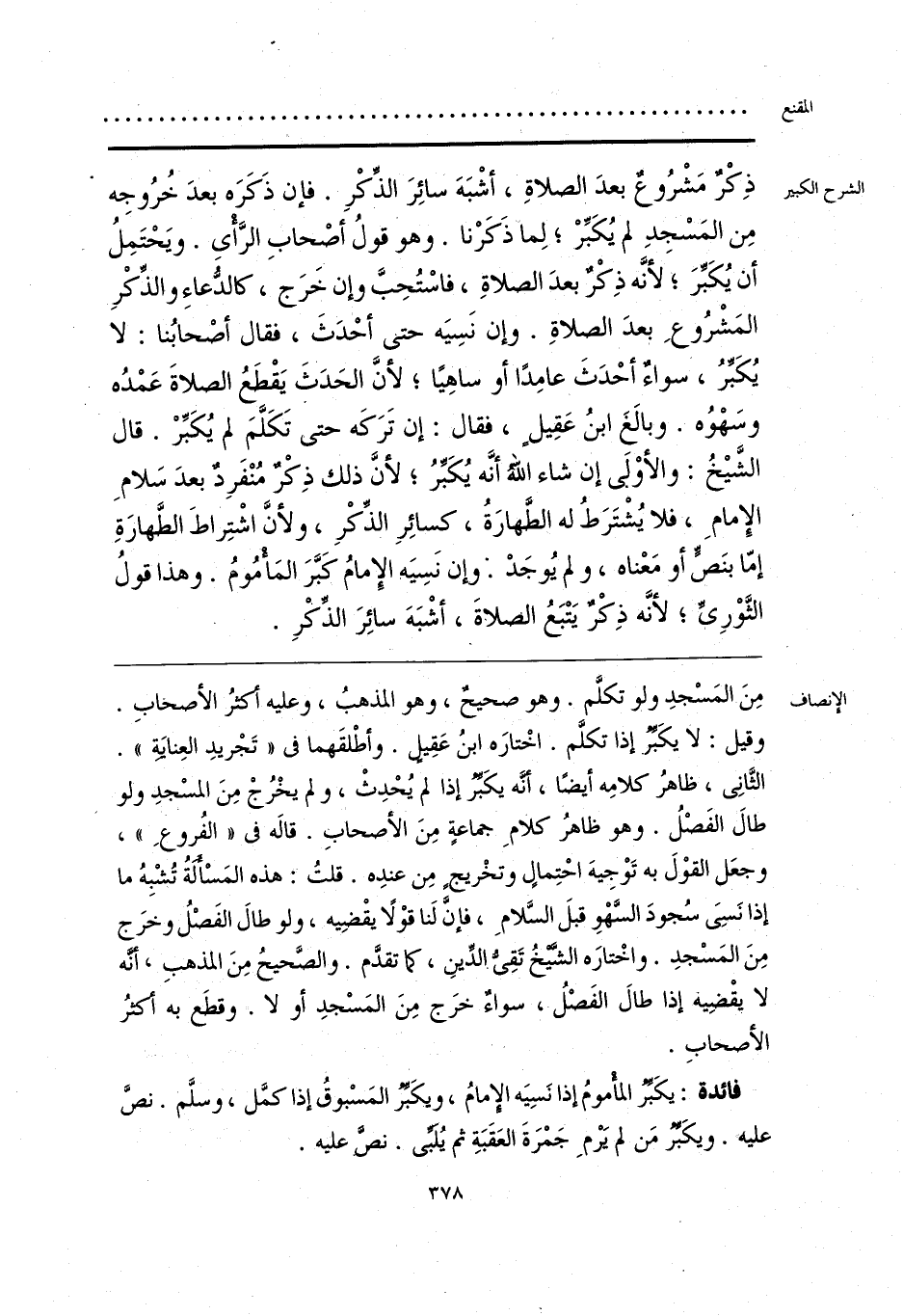 مِنَ المَسْجدِ ولو تكلَّم. وهو صحيحٌ، وهو المذهبُ، وعليه أكثرُ الأصحابِ. وقيل: لا يكَبِّرُ إذا تكلَّم. اخْتارَه ابنُ عَقِيلٍ. وأطْلقَهما فى «تَجْريدِ العِنايَةِ». الثَّانِى، ظاهرُ كلامِه أيضًا، أنَّه يكَبِّرُ إذا لم يُحْدِثْ، ولم يخْرُجْ مِنَ المسْجدِ ولو طالَ الفَصْلُ. وهو ظاهرُ كلامِ جماعةٍ مِنَ الأصحاب. قالَه فى «الفُروعِ»، وجعَل القوْلَ به تَوْجيهَ احْتِمالٍ وتخْريجٍ مِن عندِه. قلتُ: هذه المَسْأَلَةُ تُشْبِهُ ما إذا نَسِىَ سُجودَ السَّهْوِ قبلَ السَّلامِ، فإنَّ لَنا قوْلًا يقْضِيه، ولو طالَ الفَصْلُ وخرَج مِنَ المَسْجدِ. واخْتارَه الشَّيْخُ تَقِىُّ الدِّينِ, تقدَّم. والصَّحيحُ مِنَ المذهبِ، أنَّه لا يقْضِية إذا طالَ الفَصْلُ، سواءٌ خرَج مِنَ المَسْجدِ أو لا. وقطَع به أكثرُ الأصحابِ.