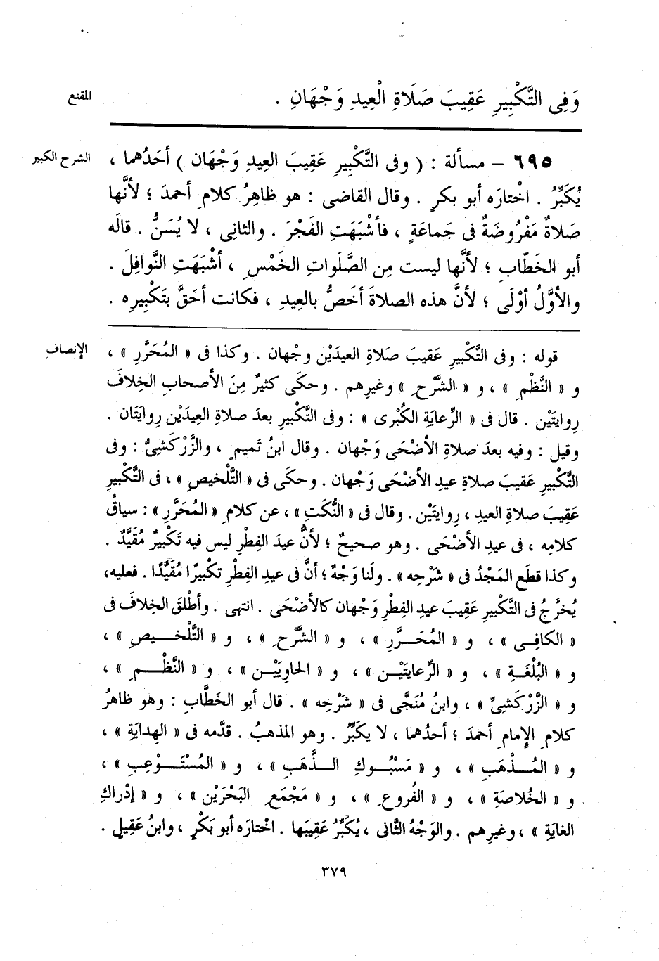 قوله: وفى التَّكْبيرِ عَقيبَ صَلاةِ العيدَيْن وجْهان. وكذا فى «المُحَرَّرِ»، و «النَّظْمِ»، و «الشَّرْحِ» وغيرِهم. وحكَى كثيرٌ مِنَ الأصحابِ الخِلافَ رِوايتَيْن. قال فى «الرِّعايَةِ الكُبْرى»: وفى التَّكْبيرِ بعدَ صلاةِ العِيدَيْن رِوايَتَان. وقيل: وفيه بعدَ صلاةِ الأضْحَى وَجْهان. وقال ابنُ تَميم، والزَّرْكَشِىُّ: وفى التَّكْبيرِ عَقيبَ صلاةِ عيدِ الأضْحَى وَجْهان. وحكَى فى «التَّلْخيصِ»، فى التَّكْبيرِ عَقِيبَ صلاةِ العيدِ، رِوايتَيْن. وقال فى «النُّكَتِ»، عن كلامِ «المُحَرَّرِ»: سياقُ كلامِه، فى عيدِ الأضْحَى. وهو صحيحٌ؛ لأنَّ عيدَ الفِطْرِ ليس فيه تَكْبيرٌ مُقَيَّدٌ. وكذا قطَع المَجْدُ فى «شَرْحِه». ولَنا وَجْهٌ؛ أنَّ فى عيدِ الفِطْرِ تكْبيرًا مُقَيَّدًا. فعليه، يُخرَّجُ فى التَّكْبيرِ عَقِيبَ عيدِ الفِطْرِ وَجْهان كالأضْحَى. انتهى. وأطْلقَ الخِلافَ فى «الكافِى»، و «المُحَرَّرِ»، و «الشَّرْحِ»، و «التَّلْخيصِ»، و «البُلْغَةِ»، و «الرِّعايتَيْن»، و «الحاوِيَيْن»، و «النَّظْمِ»، و «الزَّرْكَشِىِّ»، وابنُ مُنَجَّى فى «شَرْحِه». قال أبو الخَطَّابِ: وهو ظاهرُ كلامِ الإِمامِ أحمدَ؛ أحدُهما، لا يكَبِّرُ. وهو المذهبُ. قدَّمه فى «الهِدايَةِ»، و «المُذْهَبِ»، و «مَسْبُوكِ الذَّهَبِ»، و «المُسْتَوْعِبِ»، و «الخُلاصَةِ»، و «الفُروعِ»، و «مَجْمَعِ البَحْرَيْن»، و «إدْراكِ الغايَةِ»، وغيرِهم. والوَجْهُ الثَّانى، يُكَبِّرُ عَقِيبَها. اخْتارَه أبو بَكْرٍ، وابنُ عَقِيلٍ.