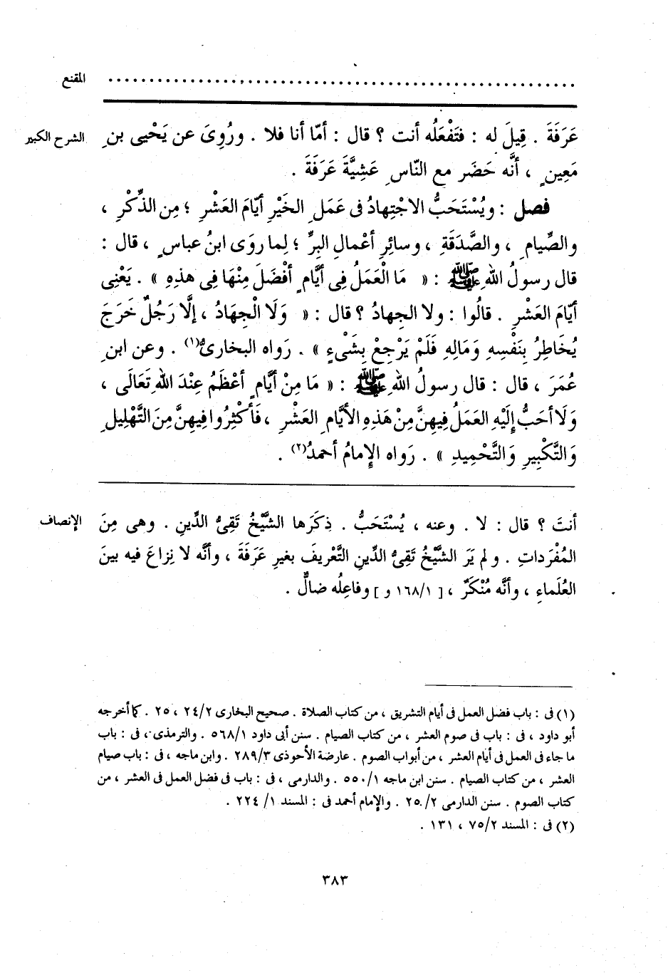 أنتَ؟ قال: لا. وعنه، يُسْتَحَبُّ. ذِكَرَها الشَّيْخُ تَقِىُّ الدِّينِ. وهى مِنَ المُفْرَداتِ. ولم يَرَ الشَّيْخُ تَقِىُّ الدِّين التَّعْريفَ بغيرِ عَرَفَةَ، وأنَّه لا نِزاعَ فيه بينَ العُلَماءِ، وأنَّه مُنْكَرٌ، وفاعِلُه ضالٌّ.