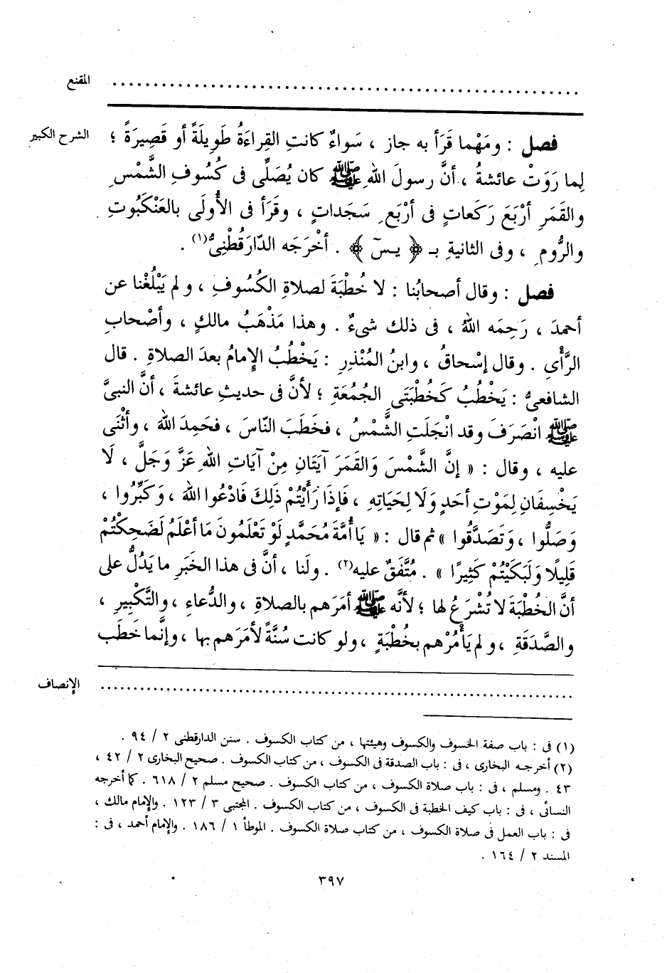 فصل: وقال أصحابُنا: لا خُطْبَةَ لصلاةِ الكُسُوفِ، ولم يَبْلُغْنا عن أحمدَ، رَحِمَه اللَّهُ، في ذلك شئٌ. وهذا مَذْهَبُ مالكٍ، وأصْحابِ الرَّأْى. وقال إسْحاقُ، وابنُ المُنْذِرِ: يَخْطُبُ الإِمامُ بعدَ الصَّلاةِ. قال الشافعىُّ: يَخْطُبُ كَخُطْبَتَى الجُمُعَةِ؛ لأنَّ في حديثِ عائشةَ، أنَّ النبىَّ -صلى اللَّه عليه وسلم- انْصَرَفَ وقد انْجَلَتِ الشَّمْسُ، فخَطَبَ النّاس، فحَمِدَ اللَّهَ، وأثْنَى عليه، وقال: «إنَّ الشَّمْسَ وَالقَمَرَ آيَتَانِ مِنْ آيَاتِ اللَّهِ عَزَّ وَجَلَّ، لَا يَخسِفَانِ لِمَوْتِ أحَدٍ وَلَا لِحَيَاتِهِ، فَإِذَا رَأَيْتُمْ ذَلِكَ فَادْعُوا اللَّهَ، وَكَبِّرُوا، وَصَلُّوا، وَتَصَدَّقُوا» ثم قال: «يَا أُمَّةَ مُحَمَّدٍ لَوْ تَعْلَمُونَ مَا أعْلَمُ لَضَحِكْتُمْ قَلِيلًا وَلَبَكَيْتُمْ كَثِيرًا». مُتَّفَقٌ عليه (¬2). ولَنا، أنَّ في هذا الخَبَرِ ما يَدُلُّ على أنَّ الخُطْبَةَ لا تُشْرع لها، لأنَّه -صلى اللَّه عليه وسلم- أمَرَهم بالصلاةِ، والدُّعاءِ، والتَّكْبِيرِ، والصَّدَقَةِ، ولم يَأْمُرْهم بخُطْبَةٍ، ولو كانت سُنَّةً لأمَرَهمِ بها، وإنَّما خَطَب