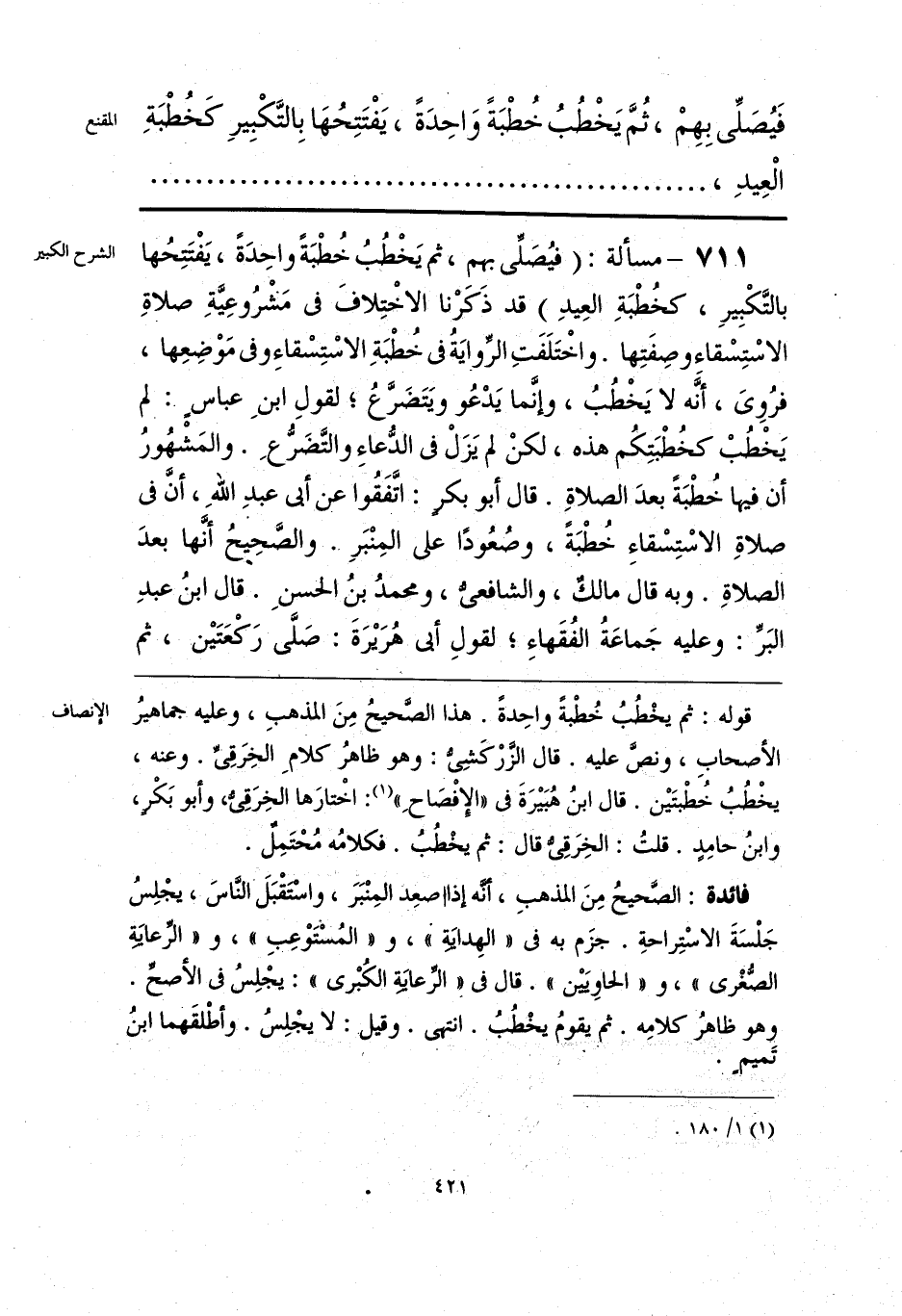 قوله: ثم يخْطُبُ خُطْبةً واحِدةً. هذا الصَّحيحُ مِنَ المذهبِ، وعليه جماهيرُ الأصحابِ، ونصَّ عليه. قال الزَّرْكَشِىُّ: وهو ظاهرُ كلامِ الخِرَقِىِّ. وعنه، يخْطُبُ خُطْبَتَيْن. قال ابنُ هُبَيْرَةَ فى «الإِفْصَاحِ» (¬1): اخْتارَها الخِرَقِىُّ، وأبو بَكْرٍ، وابنُ حامِدٍ. قلتُ: الخِرَقِىُّ قال: ثم يخْطُبُ. فكلامُه مُحْتَمِلٌ.