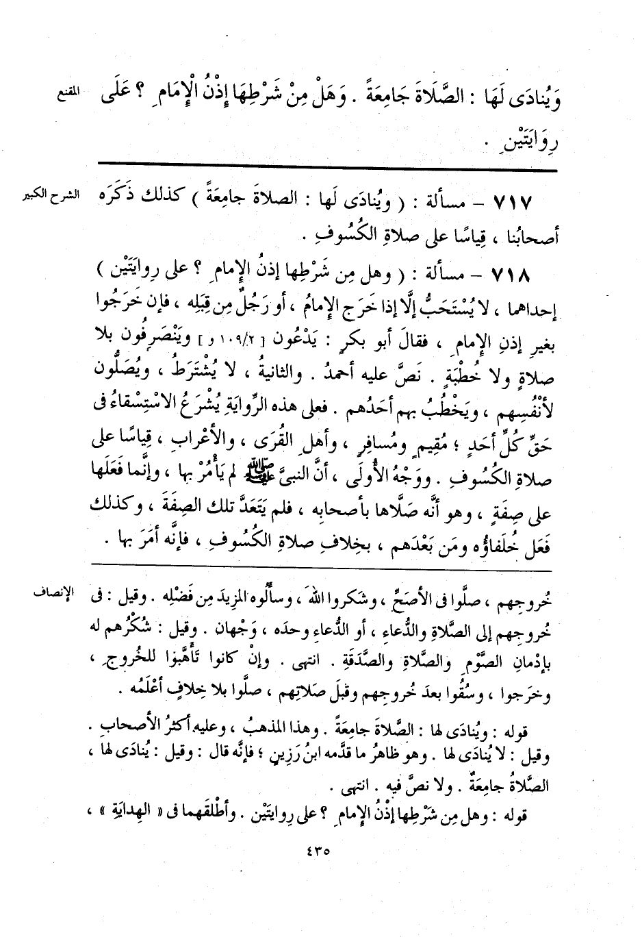 وَيُنادَى لَهَا: الصَّلَاةَ جَامِعَةً. وَهَلْ مِنْ شَرْطِهَا إِذْنُ الإِمَامِ؟ عَلَى رِوَايَتَيْن.