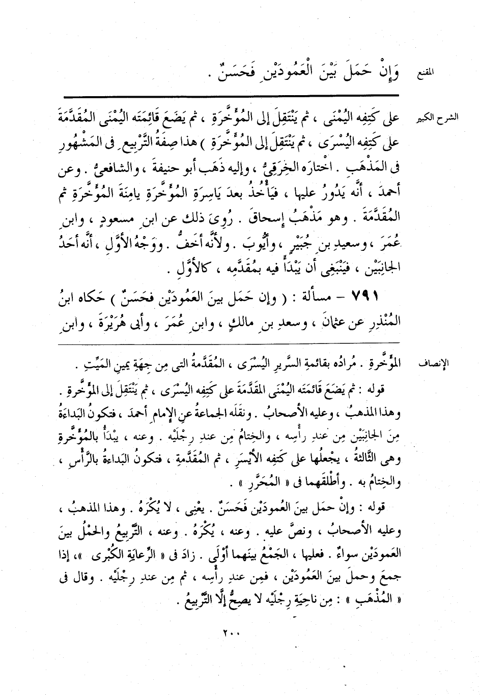 قوله: وإنْ حمَل بينَ العُمودَيْن فَحَسَنٌ. يعْنِى، لا يُكْرهُ. وهذا المذهبُ، وعليه الأصحابُ، ونصَّ عليه. وعنه، يُكْرهُ. وعنه، التَّربِيعُ والحمْلُ بينَ العَمودَيْن سواءٌ. فعليها، الجَمْعُ بينَهما أوْلَى. زادَ فى «الرِّعايَةِ الكُبْرى»، إذا جمعَ وحملَ بينَ العَمُودَيْن، فمِن عندِ رأْسِه، ثم مِن عندِ رِجْلَيْه. وقال فى «المُذْهبِ»: مِن ناحِيَةٍ رِجْلَيْه لا يصِحُّ إلَّا التَّرْبِيعُ.