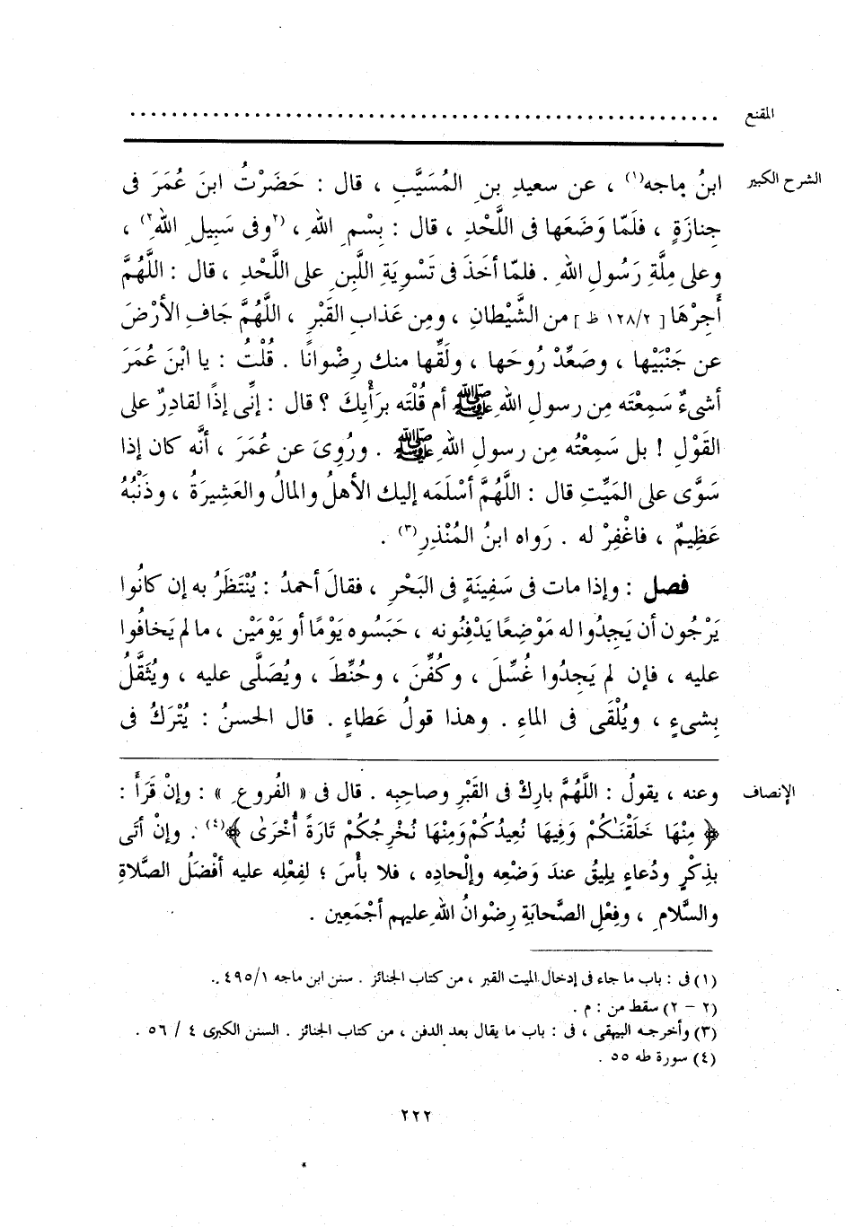 وعنه، يقولُ: اللَّهُمَّ بارِكْ فى القَبْرِ وصاحِبِه. قال فى «الفُروعِ»: وإنْ قَرَأ: {مِنْهَا خَلَقْنَاكُمْ وَفِيهَا نُعِيدُكُمْ وَمِنْهَا نُخْرِجُكُمْ تَارَةً أُخْرَى} (¬1). وإنْ أتَى بذِكْرٍ ودُعاءٍ يلِيقُ عندَ وَضْعِه وإلْحادِه، فلا بأْسَ؛ لفِعْلِه عليه أفْضَلُ الصَّلاةِ والسَّلامِ، وفِعْلِ الصَّحابَةِ رِضْوانُ اللهِ عليهم أجْمَعِين.