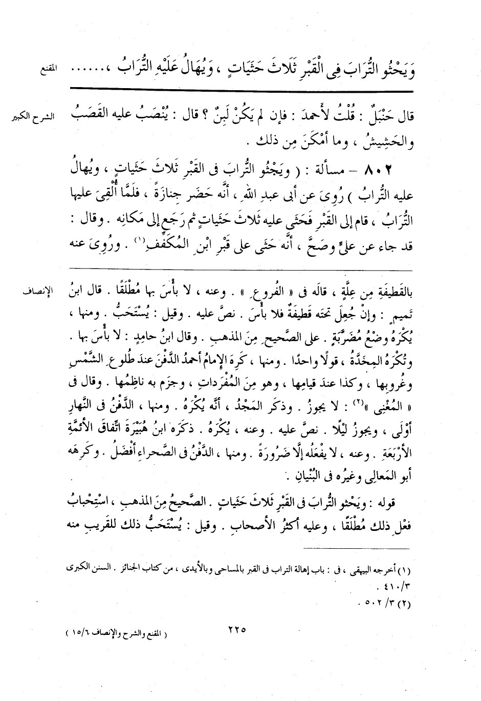 وَيَحْثُو التُّرَابَ فِى الْقَبْرِ ثَلَاثَ حَثَيَاتٍ، وَيُهَالُ عَلَيْهِ التُّرَابُ،