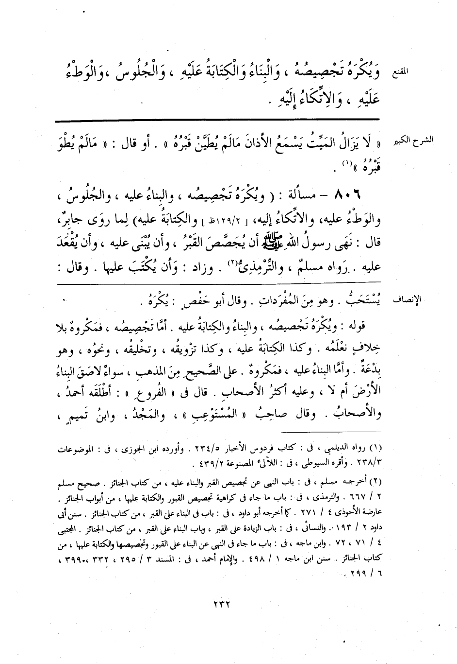 قوله: ويُكْرَهُ تَجْصيصُه، والبِناءُ والكِتابَةُ عليه. أمَّا تَجْصِيصُه، فمَكْروهٌ بلا خِلافٍ نعْلَمُه. وكذا الكِتابَةُ عليه، وكذا تزْويقُه، وتخْليقُه، ونحوُه، وهو بِدْعَةٌ. وأمَّا البِناءُ عليه، فمَكْروهٌ. على الصحيحِ مِنَ المذهبِ، سواءٌ لاصَقَ البِناءُ الأرْضَ أم لا، وعليه أكثرُ الأصحابِ. قال فى «الفُروعِ»: أطْلَقَه أحمدُ، والأصحابُ. وقال صاحِبُ «المُسْتَوْعِبِ»، والمَجْدُ، وابنُ تَميمٍ،