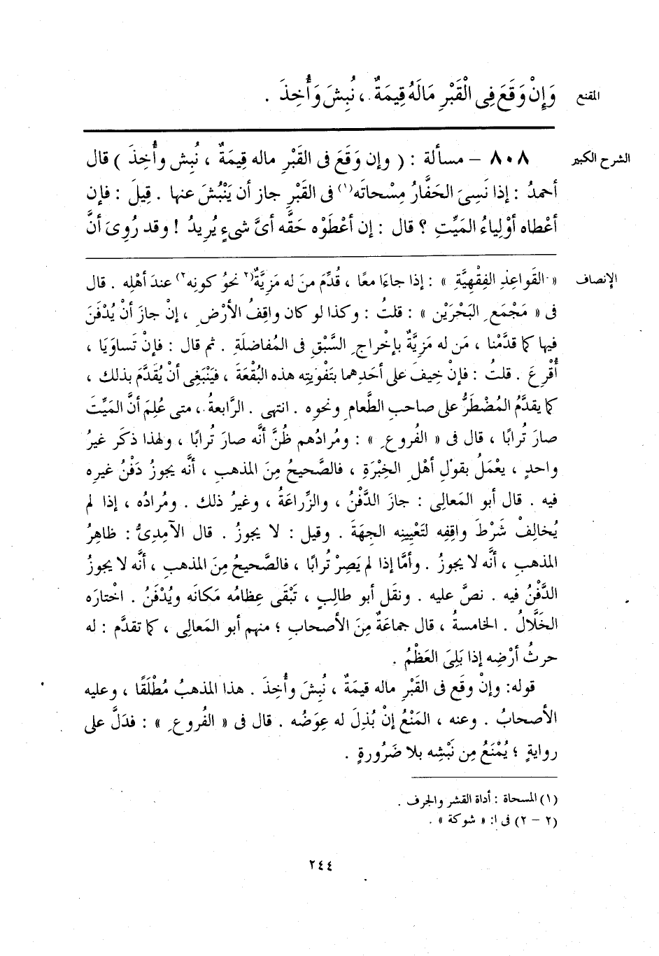 قوله: وإنْ وقَع فى القَبْرِ ماله قيمَةٌ، نُبِشَ وأُخِذَ. هذا المذهبُ مُطْلَقًا، وعليه الأصحابُ. وعنه، المَنْعُ إنْ بُذِلَ له عِوَضُه. قال فى «الفُروعِ»: فدَلَّ على روايةٍ؛ يُمْنَعُ مِن نَبْشِه بلا ضَرُورةٍ.