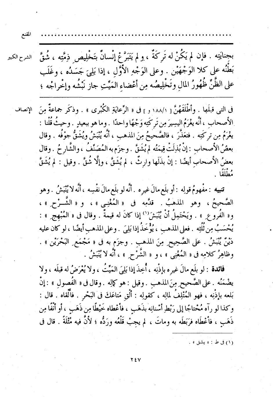 فى التى قبلَها. وأطْلَقَهُنَّ فى «الرعايَةِ الكُبْرى». وذكَر جماعةٌ مِنَ الأصحابِ، أنَّه يغْرَمُ اليسِيرَ مِن تَرِكَتِه وَجْهًا واحدًا. وما هو ببعيدٍ. وحيثُ قُلْنا: يغْرَمُ مِن ترِكَتِه. فتعَذَّرَ، فالصَّحيحُ مِنَ المذهبِ، أنَّه يُنْبَشُ ويشَقُّ جوْفُه. وقال بعضُ الأصحابِ: إنْ بُذِلَتْ قِيمَتُه لم يُشَقَّ. وجزَم به المُصَنِّفُ، والشَّارِحُ. وقال بعضُ الأصحابِ أيضًا: إنْ بذَلَها وارِثٌ، لم يُشَقَّ، - وإلَّا شُقَّ. وقيل: لم يُشَقَّ مُطْلَقًا.