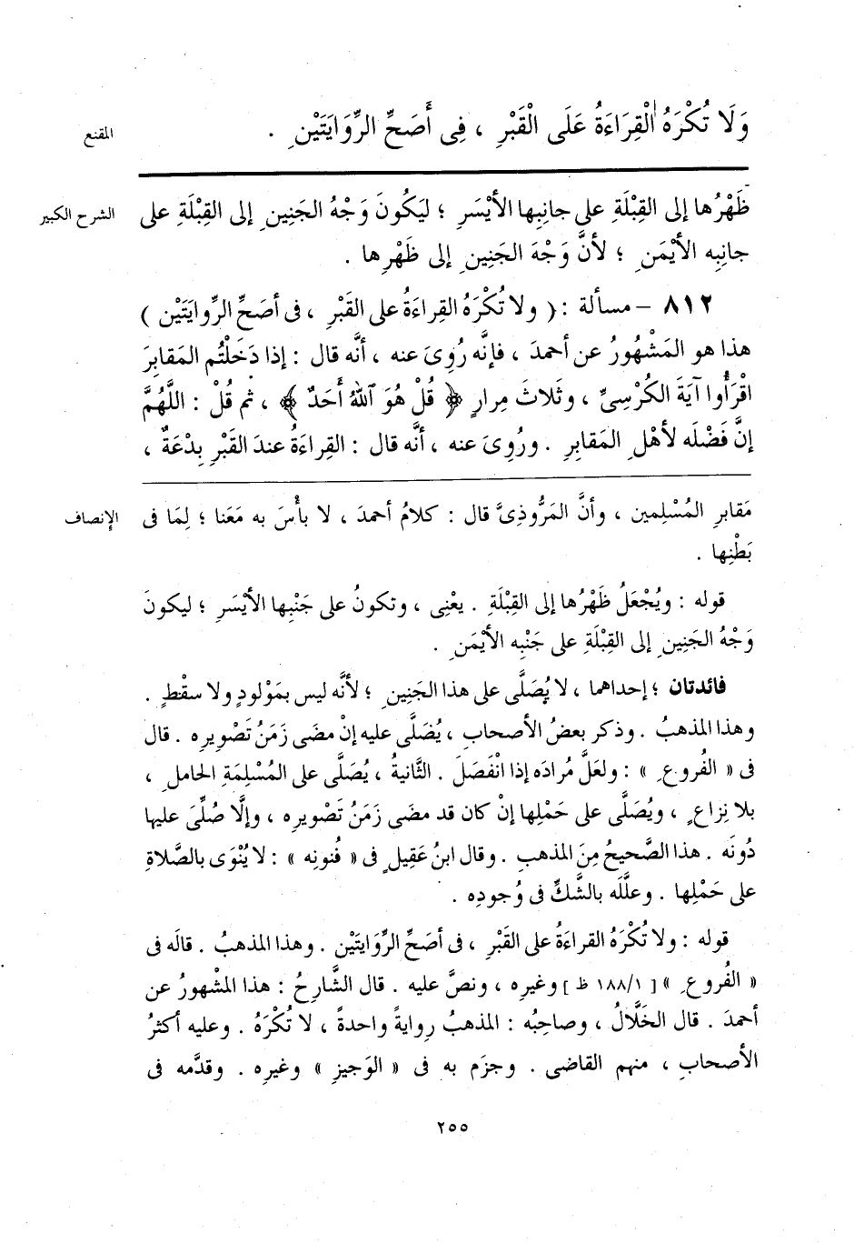 قوله: ولا تُكْرَهُ القراءَةُ على القَبْرِ، فى أصَحِّ الرِّوَايتَيْن. وهذا المذهبُ. قالَه فى «الفُروعِ» وغيرِه، ونصَّ عليه. قال الشَّارِحُ: هذا المشْهورُ عن أحمدَ. قال الخَلَّالُ، وصاحِبُه: المذهبُ رِوايةً واحدةً، لا تُكْرَهُ. وعليه أكثرُ الأصحابِ، منهم القاضى. وجزَم به فى «الوَجيزِ» وغيرِه. وقدَّمه فى