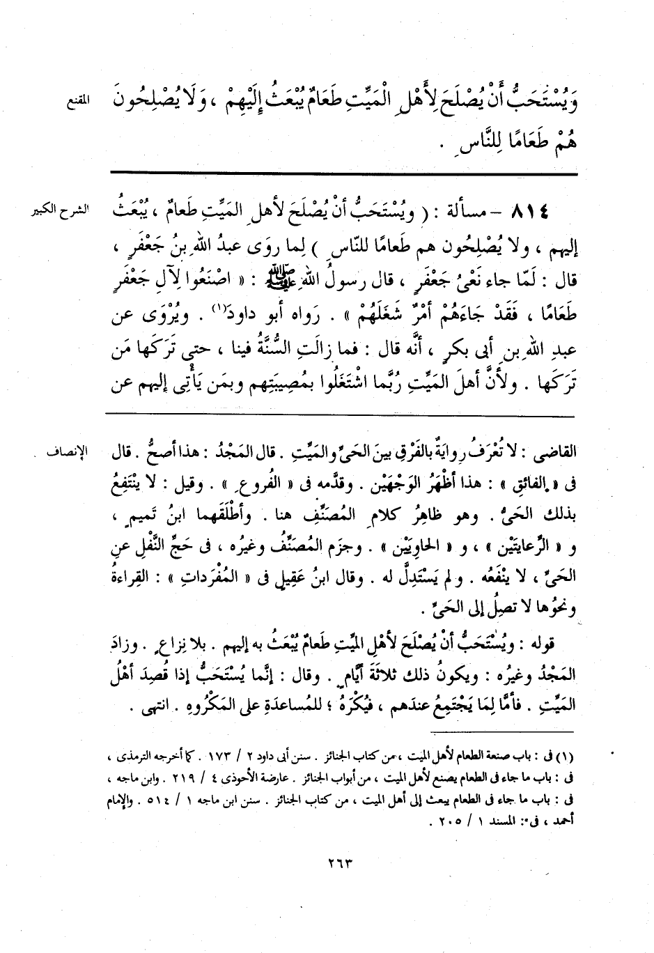 ويُسْتَحَبُّ أَنْ يُصْلَحَ لِأَهْلِ الْمَيِّتِ طَعَامٌ يُبْعَثُ إِلَيْهِمْ، وَلَا يُصْلِحُونَ هُمْ طَعَامًا لِلنَّاسِ.