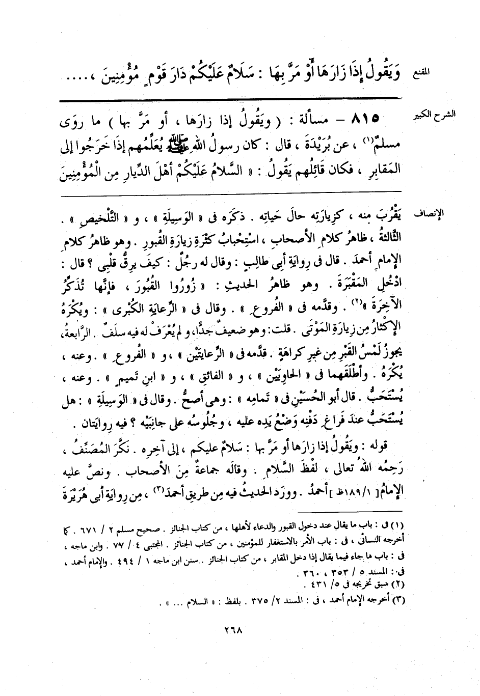 قوله: ويَقُولُ إذا زارَها أو مَرَّ بها: سَلامٌ عليكم، إلى آخِرِه. نَكَّرَ المُصَنِّفُ، رَحِمُه اللهُ تعالى، لفْظَ السَّلامِ. وقالَه جماعةٌ مِنَ الأصحاب. ونصَّ عليه الإمامُ أحمدُ. وورَد الحديثُ فيه مِن طريقِ أحمدَ (¬2)، مِن رِوايَةِ أبى هُرَيْرَةَ