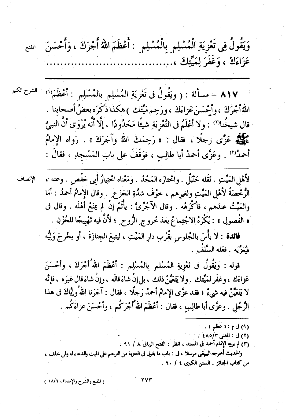 قوله: ويَقُولُ فى تَعْزِيةِ المُسْلمِ بِالمُسْلِمِ: أعْظَمَ اللهُ أجْرَكَ، وأحْسَنَ عَزاءَك، وغفَر لمَيِّتك. ولا يَتَعَيَّنُ ذلك، بل إنْ شاءَ قالَه، وإنْ شاءَ قال غيَره، فإنَّه لا يَتَعَيَّنُ فيه شئٌ؛ فقد عزَّى الإمامُ أحمدُ رَجلًا، فقال: آجَرَنا اللهُ وإيَّاكَ فى هذا الرَّجُلِ. وعزَّى أبا طالِبٍ، فقال: أعْظَمَ الله أجْرَكُم، وأحْسَنَ عزاءَكُم.