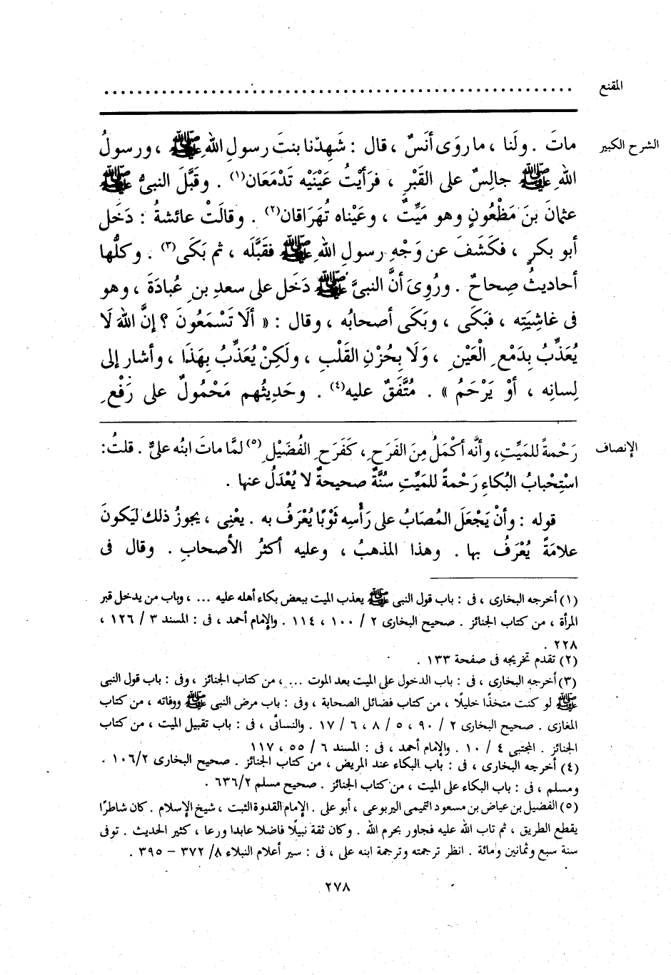 رَحْمةً للمَيِّتِ، وأنّه أكْمَلُ مِنَ الفَرَحِ، كَفَرَحِ الفُضَيْلِ (¬1) لمَّا ماتَ ابنُه علىٌّ. قلتُ: اسْتِحْبابُ البُكاءِ رَحْمةً للمَيِّتِ سُنَّةٌ صحيحةٌ لا يُعْدَلُ عنها.