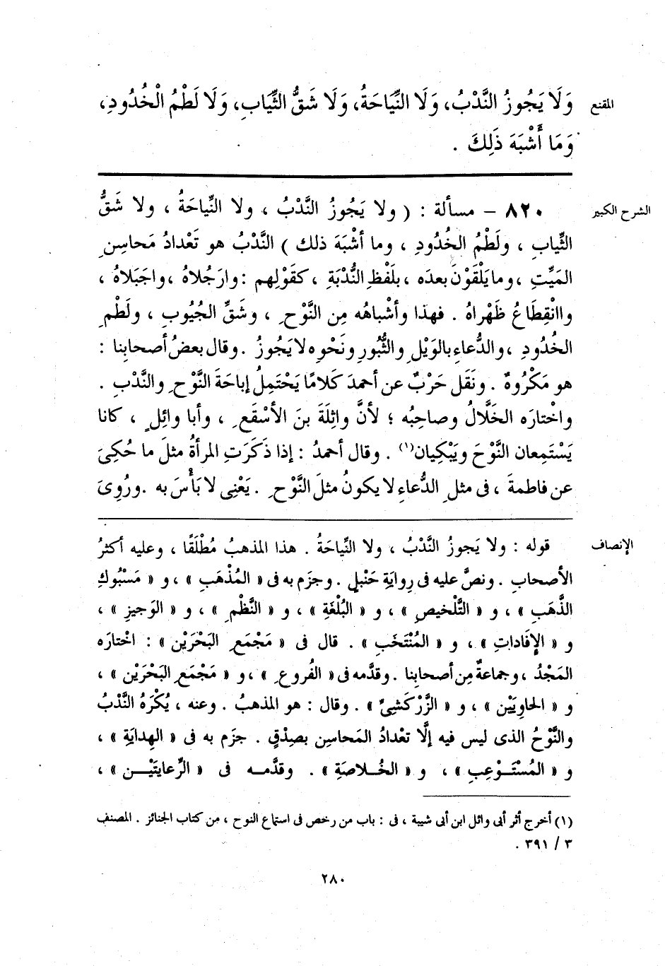 قوله: ولا يَجوزُ النَّدْبُ، ولا النِّياحَةُ. هذا المذهبُ مُطْلَقًا، وعليه أكثرُ الأصحابِ. ونصَّ عليه فى رِوايَةِ حَنْبلٍ. وجزَم به فى «المُذْهَبِ»، و «مَسْبُوكِ الذَّهَبِ»، و «التَّلْخيصِ»، و «البُلْغةِ»، و «النَّظْمِ»، و «الوَجيزِ»، و «الإفَاداتِ»، و «المُنْتَخَبِ». قال فى «مَجْمَعِ البَحْرَيْن»: اخْتارَه المَجْدُ، وجماعةٌ مِن أصحابِنا. وقدَّمه فى «الفُروعِ»، و «مَجْمَعِ البَحْرَيْن»، و «الحاوِيَيْن»، و «الزَّرْكَشىِّ». وقال: هو المذهبُ. وعنه، يُكْرَهُ النَّدْبُ والنَّوْحُ الذى ليس فيه إلَّا تعْدادُ المَحاسِن بصِدْقٍ. جزَم به فى «الهِدايَةِ»، و «المُسْتَوْعِبِ»، و «الخُلاصَةِ». وقدَّمه فى «الرِّعايتَيْن»،