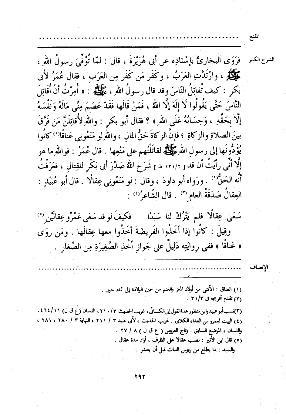 بينَ الصلاةِ والزكاةِ؛ فإنَّ الزكاةَ حَقُّ المالِ، واللهِ لو مَنَعُونِى عَناقاً (¬1) كانُوا يُؤَدُّونَها إلى رسولِ اللهِ -صلى الله عليه وسلم- لقاتَلْتُهم على مَنْعِها. قال عُمَرُ: فواللهِ ما هو إلَّا أنِّى رأيْتُ أن قد شَرَح اللهُ صَدْرَ أبى بَكْرٍ للقِتالِ، فعَرَفْتُ أنَّه الحَقُّ (¬2). ورَواه أبو داودَ، وقال: لو مَنَعُونِى عِقالاً. قال أبو عُبَيْدٍ: العِقالُ صَدَقَةُ العامِ (¬3). قال الشّاعرُ (¬4):