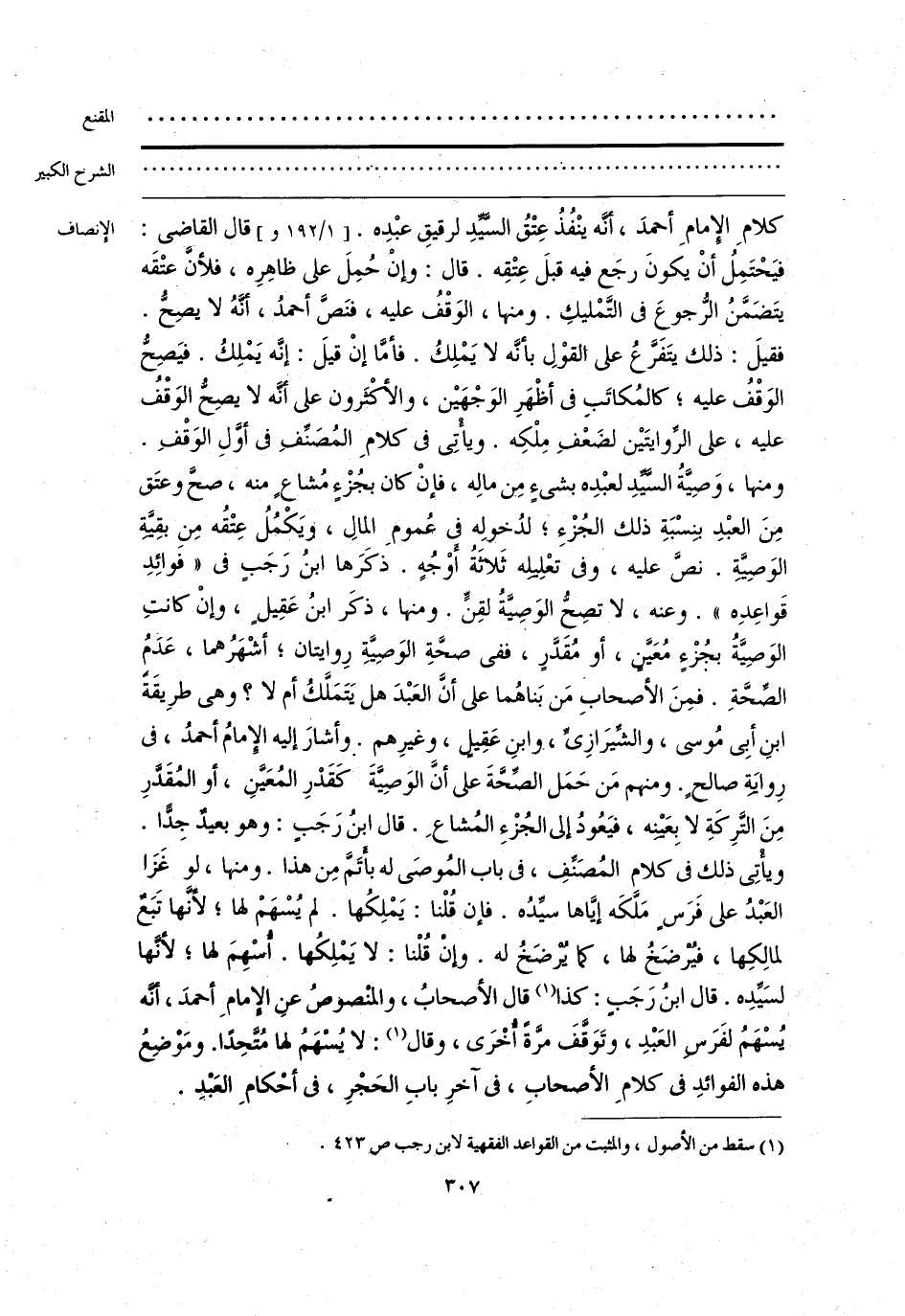 ومنها، وَصِيَّةُ السَّيِّدِ لعبْدِه بشئٍ مِن مالِه، فإنْ كان بجُزْءٍ مُشاعٍ منه، صحَّ وعتَق مِنَ العبْدِ بنِسْبَةِ ذلك الجُزْءِ؛ لدُخولِه فى عُمومِ المالِ، ويَكْمُلُ عِتْقُه مِن بقِيَّةِ الوَصِيَّةِ. نصَّ عليه، وفى تعْلِيلِه ثَلاَثةُ أَوْجُهٍ. ذَكَرَها ابنُ رَجَبٍ فى «فَوائِدِ قَواعِدِه». وعنه، لا تصِحُّ الوَصِيَّةُ لقِنٍّ. ومنها، ذكَر ابنُ عَقِيلٍ، وإنْ كانتِ الوَصِيَّةُ بجُزْءٍ مُعَيَّن، أو مُقَدَّرٍ، ففى صحَّةِ الوَصِيَّةِ رِوايتان؛ أشْهَرُهما، عَدَمُ الصِّحَّةِ. فمِنَ الأصحابِ مَن بَناهُما على أنَّ العَبْدَ هل يَتَمَلَّكُ أم لا؟ وهي طرِيقَة ابنِ أبِى مُوسى، والشِّيرَازِىِّ، وابنِ عَقِيلٍ، وغيرِهم. وأشارَ إليه الإِمامُ أحمدُ، فى رِوايَةِ صالحٍ. ومنهم مَن حَمَل الصِّحَّةَ على أنَّ الوَصِيَّةَ كَقَدْرِ المُعَيَّنِ، أو المُقَدَّرِ مِنَ التَّرِكَةِ لا بِعَيْنِه، فيَعُودُ إلى الجُزْءِ المُشاعِ. قال ابنُ رَجَبٍ: وهو بعيدٌ جِدّاً.