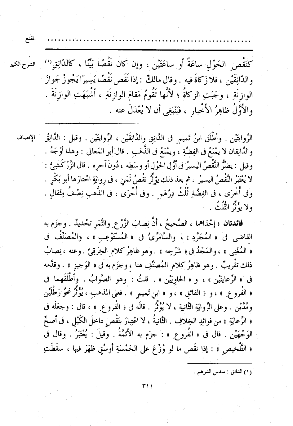 الرِّوايتَيْن. وأطْلَقَ ابنُ تَميمٍ في الدَّانِقِ والدَّانِقَيْن، الرِّوايتَيْن. وقيل: الدَّانِقُ والدَّانِقان لا يمْنَعُ في الفِضَّةِ، ويمْنَعُ في الذَّهَبِ. قال أبو المَعالي: وهذا أوْجَهُ.