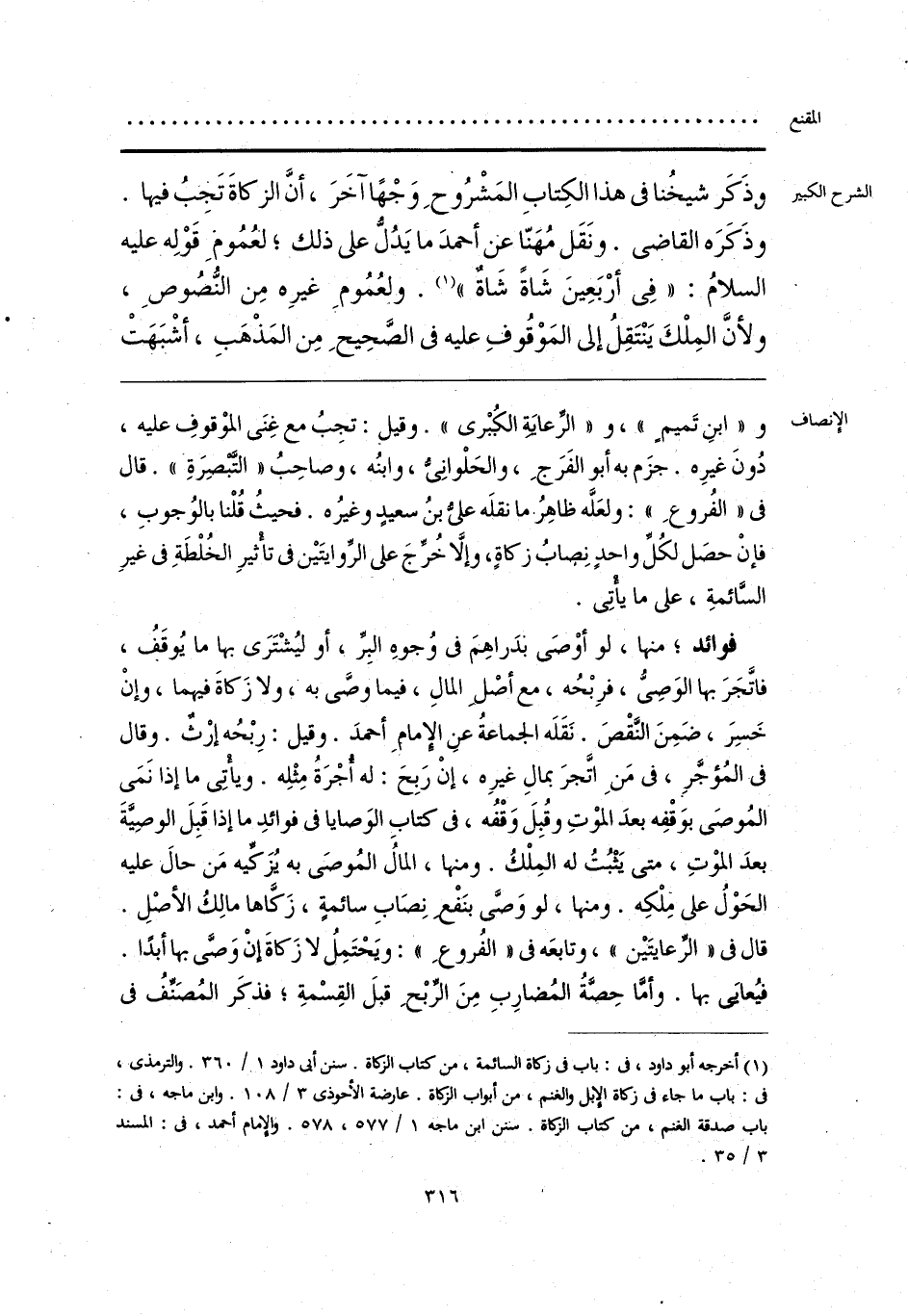 فوائد؛ منها، لو أوْصَى بدَراهِمَ في وُجوهِ البِرِّ، أو ليُشْتَرَى بها ما يُوقف، فاتَّجَرَ بها الوَصِىُّ، فرِبْحُه، مع أصْل المالِ، فيما وصَّى به، ولا زَكاةَ فيهما، وإنْ خَسِرَ، ضَمِنَ النَّقْصَ. نَقَلَه الجماعةُ عنِ الإمامِ أحمدَ. وقيل: رِبْحُه إرْثٌ. وقال في المُؤجَّر، في مَنِ اتَّجرَ بمالِ غيرِه، إنْ رَبِحَ: له أجْرَةُ مِثْلِه. ويأتِى ما إذا نَمَى المُوصَى بوَقْفِه بعدَ الموْتِ وقُبِلَ وَقْفُه، في كتابِ الوَصايا في فوائدِ ما إذا قَبِلَ الوصِيَّةَ بعدَ الموْتِ، متى يَثْبُتُ له المِلْكُ. ومنها، المالُ المُوصَى به يُزَكِّيه مَن حالَ عليه الحَوْلُ على مِلْكِه. ومنها، لو وَصَّى بنَفْع نِصَابِ سائمةٍ، زَكَّاها مالِكُ الأصْلِ.
