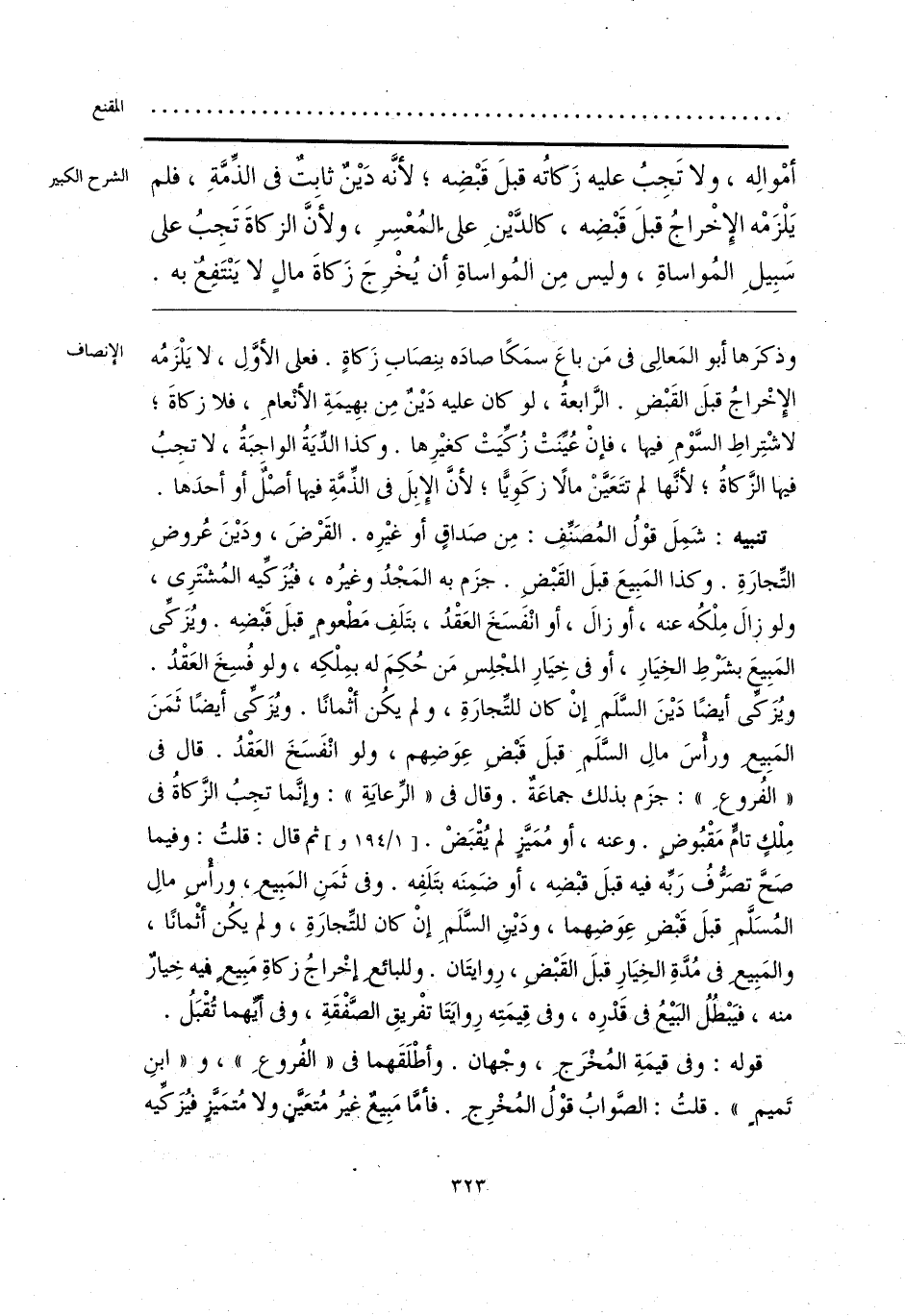 المُسَلَّمِ قبلَ قَبْضِ عِوَضِهما، ودَيْنِ السَّلَمِ إنْ كان للتِّجارَةِ، ولم يكُن أثْمانًا، والمَبِيعِ في مُدَّةِ الخِيَارِ قبل القَبْضِ، رِوايتَان. وللبائعِ إخْراجُ زكاةِ مَبِيعٍ فيه خِيارٌ منه، فيَبْطُل البَيْعُ في قَدْرِه، وفى قِيمَتِه رِوايَتَا تفْريقِ الصَّفْقَةِ، وفى أيَّهما تُقْبَلُ.