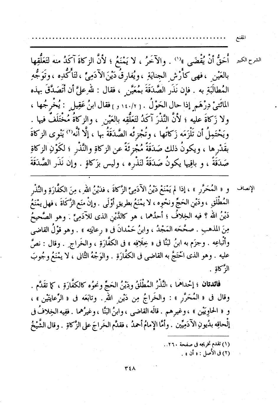 و «المُحَرَّرِ»، إذا لم يَمْنَعْ دَيْنُ الآدَمِىِّ الزَّكاةَ، فدَيْنُ اللهِ، مِنَ الكفَّارَةِ والنَّذْرِ المُطْلَقِ، ودَيْنِ الحَجِّ ونحْوِه، لا يمْنَعُ بطريقٍ أوْلَى. وإنْ منَع الزَّكَاةَ، فهل يمْنَعُ دَيْنُ الله؟ فيه الخِلافُ؛ أحدُهما، هو كالدَّيْنِ الذى للآدَمِىِّ. وهو الصَّحيحُ مِنَ المذهبِ. صحَّحَه المَجْدُ، وابنُ حَمْدانَ فى «رِعايَتِه». وهو قوْلُ القاضى وأتْباعِه. وجزَم به ابنُ لبَنَّا فى «خِلَافِه» فى الكفَّارَةِ، والخَراجِ. وقال: نصَّ عليه. وهو الذى احْتَجَّ به القاضى فى الكفَّارَةِ. والوَجْهُ الثَّانى، لا يمْنَعُ وجُوبَ الزَّكاةِ.