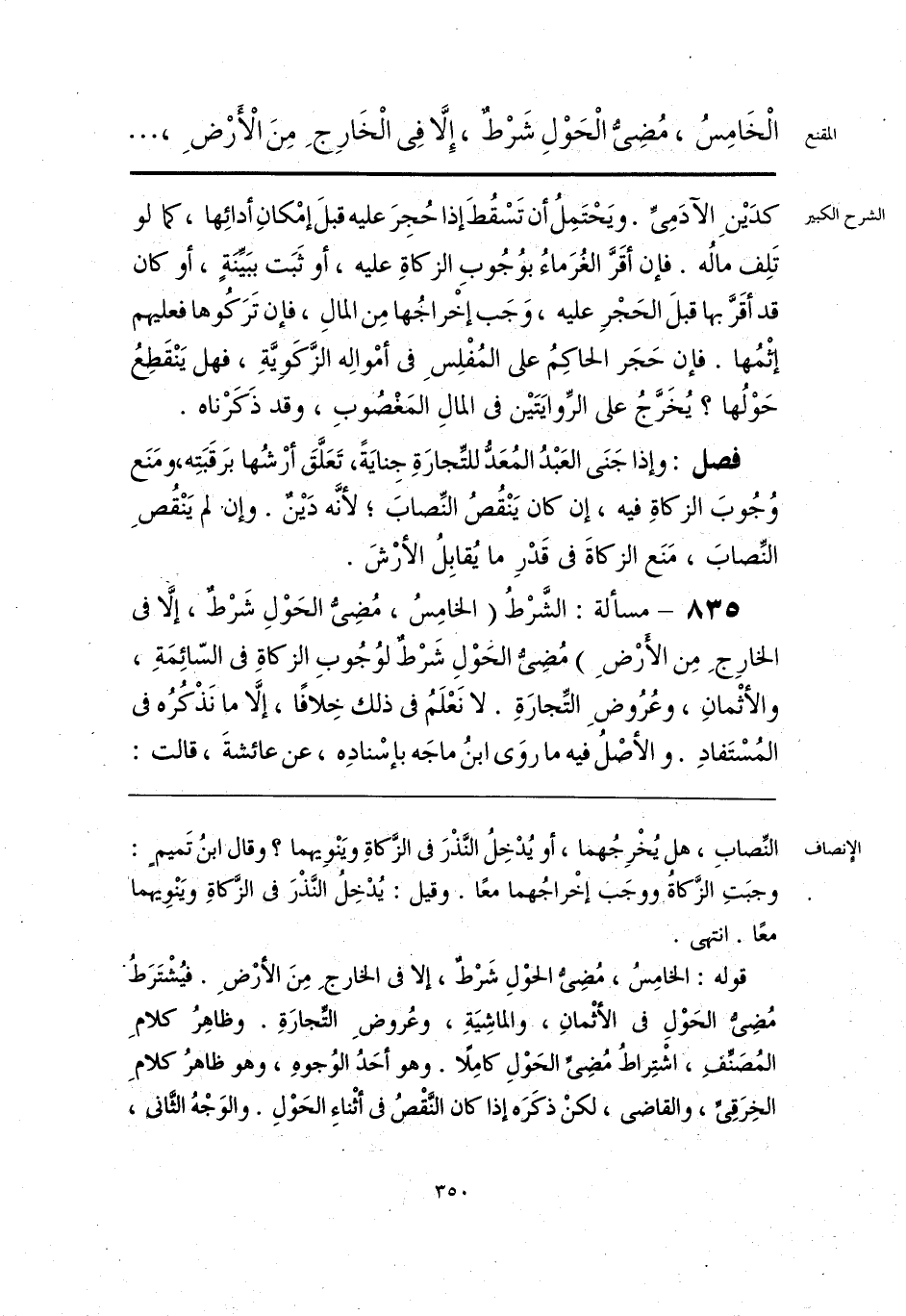 قوله: الخامِسُ، مُضِىُّ الحوْلِ شَرْطٌ، إلا فى الخارجِ مِنَ الأرْضِ. فيُشْتَرَطُ مُضِىُّ الحَوْلِ فى الأثْمانِ، والماشِيَةِ، وعُروضِ التِّجارَةِ. وظاهِرُ كلامِ المُصَنِّفِ، - اشْتِراطُ مُضِيِّ الحَوْلِ كامِلًا. وهو أحَدُ الوُجوهِ، وهو ظاهرُ كلامِ الخِرَقِيِّ، والقاضى، لكنْ ذكَرَه إذا كان النَّقْصُ فى أثْناءِ الحَوْلِ. والوَجْهُ الثَّانى،